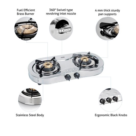 2 Burner Stainless Steel Gas Stove with Brass Burner (1026 SS)