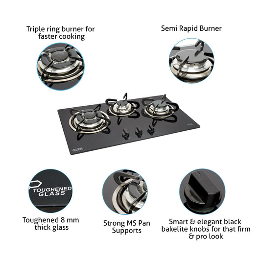 2 Burner Glass Gas Stove with High Flame Brass Burner Black (1021 GT HF BB BL) - Manual/Auto Ignition