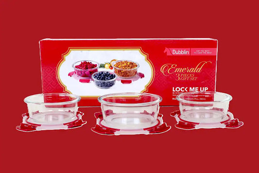 DUBBLIN Emrald 3 Pcs gift set | Oven Safe | Premium Round Glass Containers | Gift Set | Borosilicate Containers (1 x 640 ml, 2 x 390 ml)