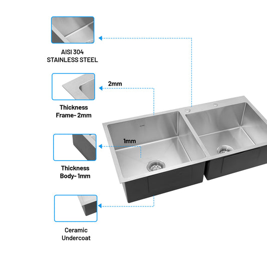 GLEN Stainless Steel Grade 304 Sink for Kitchen | Double Bowl Handmade Sink with Half Faucet Deck 32x18x9 inches | Matte Finish (KS-SH32189DBHFDM)