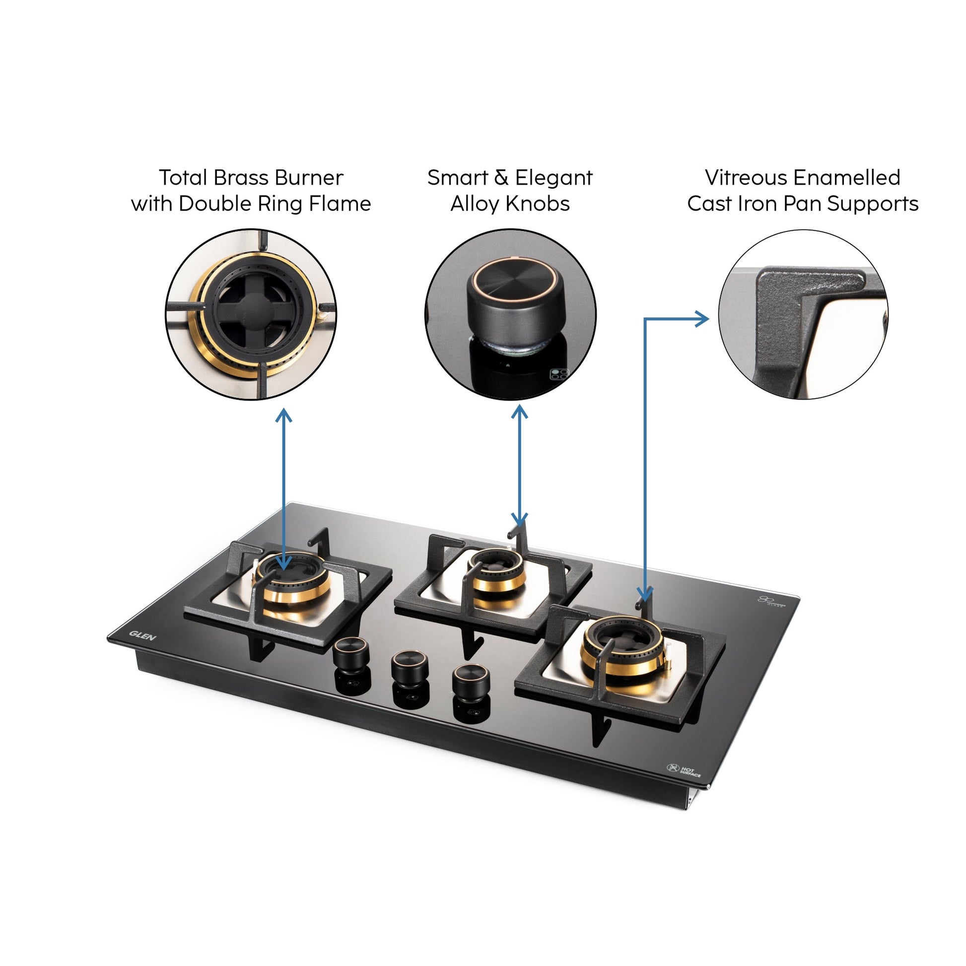 3 Burner Glass Gas Hob Top with Total Double Ring Brass Burner (BH1073SQHTTDB)