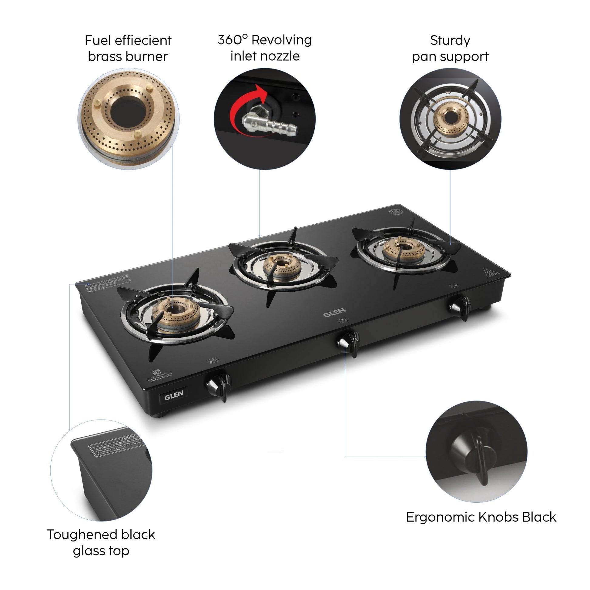 3 Burner Glass Gas Stove with Brass Burner Black - Manual/Auto Ignition (1030 GT BB BL)