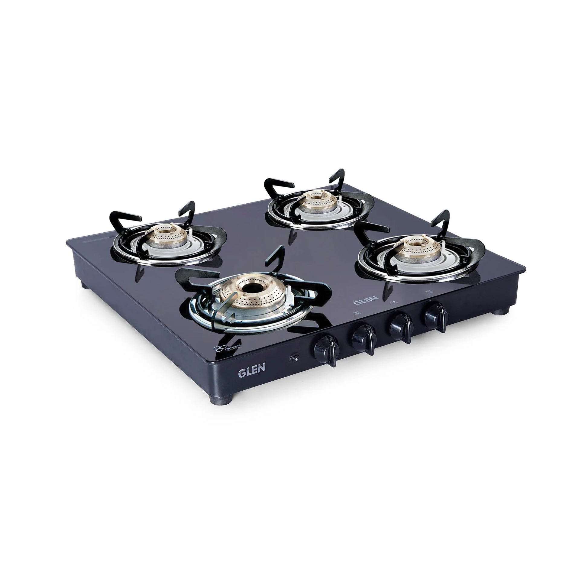 4 Burner Glass Gas Stove 1 High Flame 3 Brass Burners Double Drip Trays Black Auto Ignition (1043 GT HFBB DD BL AI)