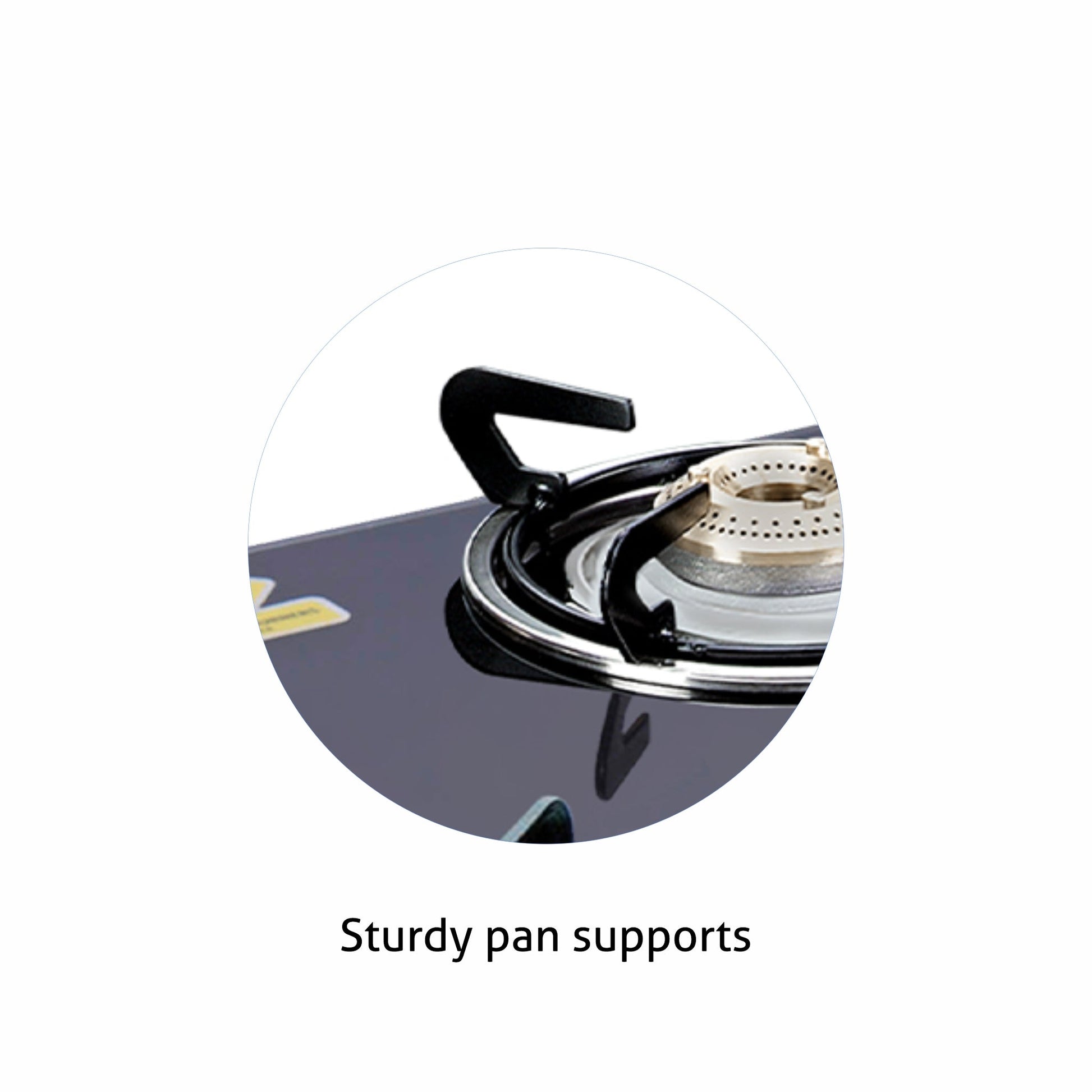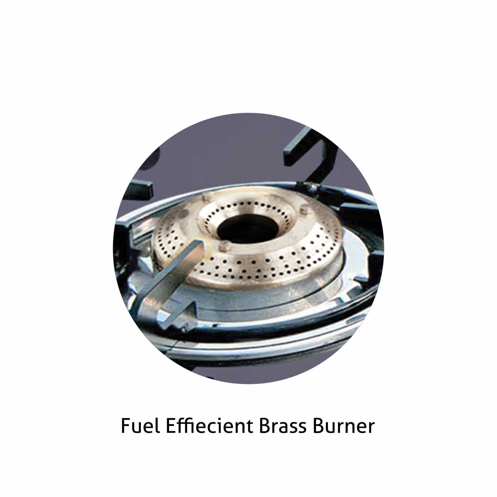 An auto ignition gas stove equipped with 4 DifferentB fuel efficientB brass burners: 1 High flame, 1 Big and 2 Small Burner for diverse cooking requirements.