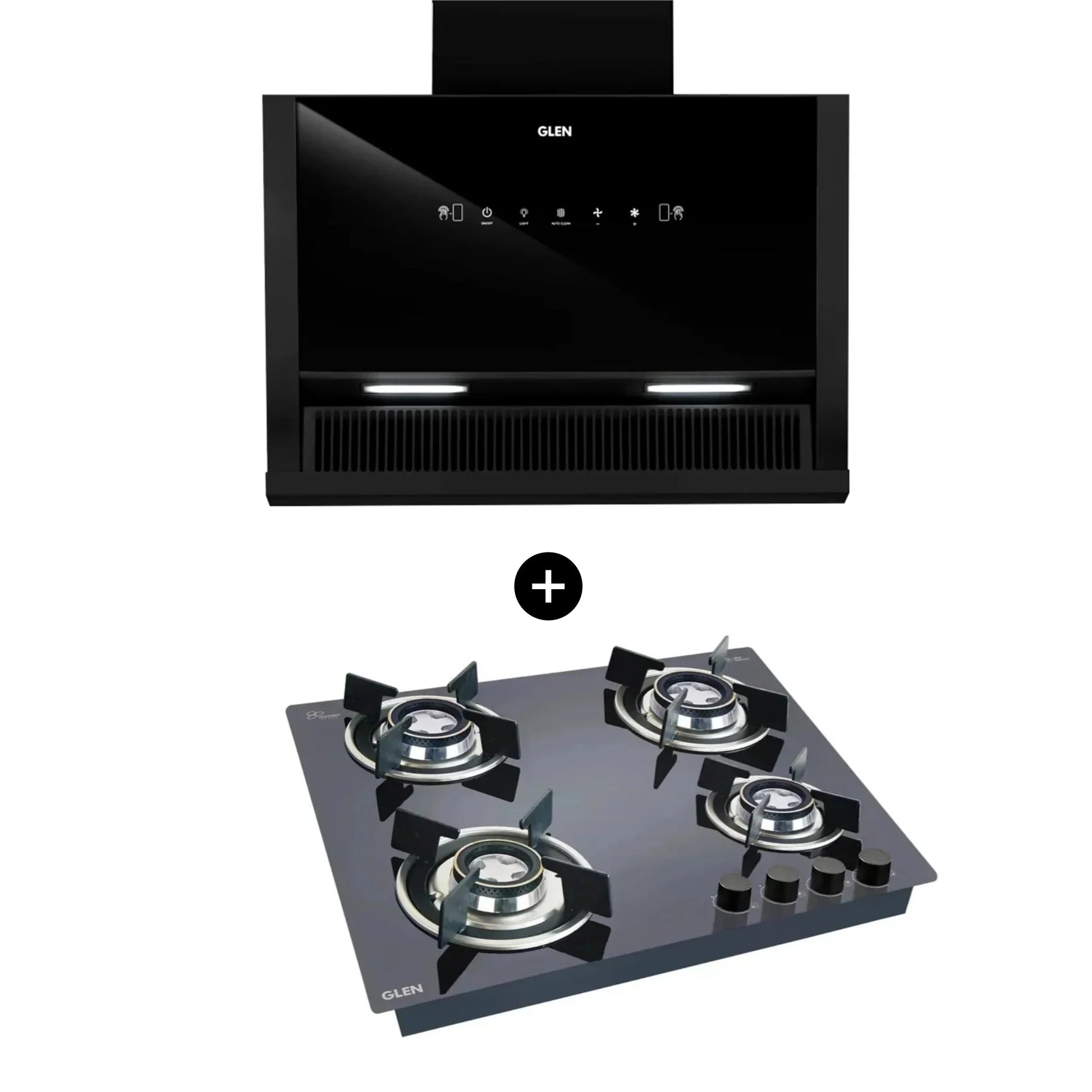 4 Burner Glass Hob Top Double Ring Forged Brass Burners (1064 RO HT DB) + Auto Clean Glass Filterless Chimney 60cm 1200m3/h (6072SXAC)