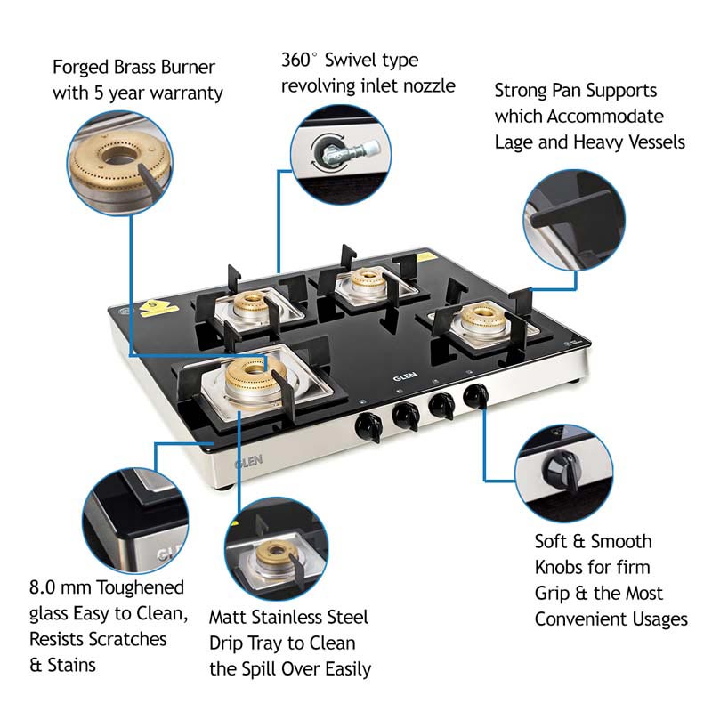 A manual operated gas stove equipped with 4 DifferentB forgedB brass burners: 1 High flame, 1 Big and 2 Small Burner for diverse cooking requirements.