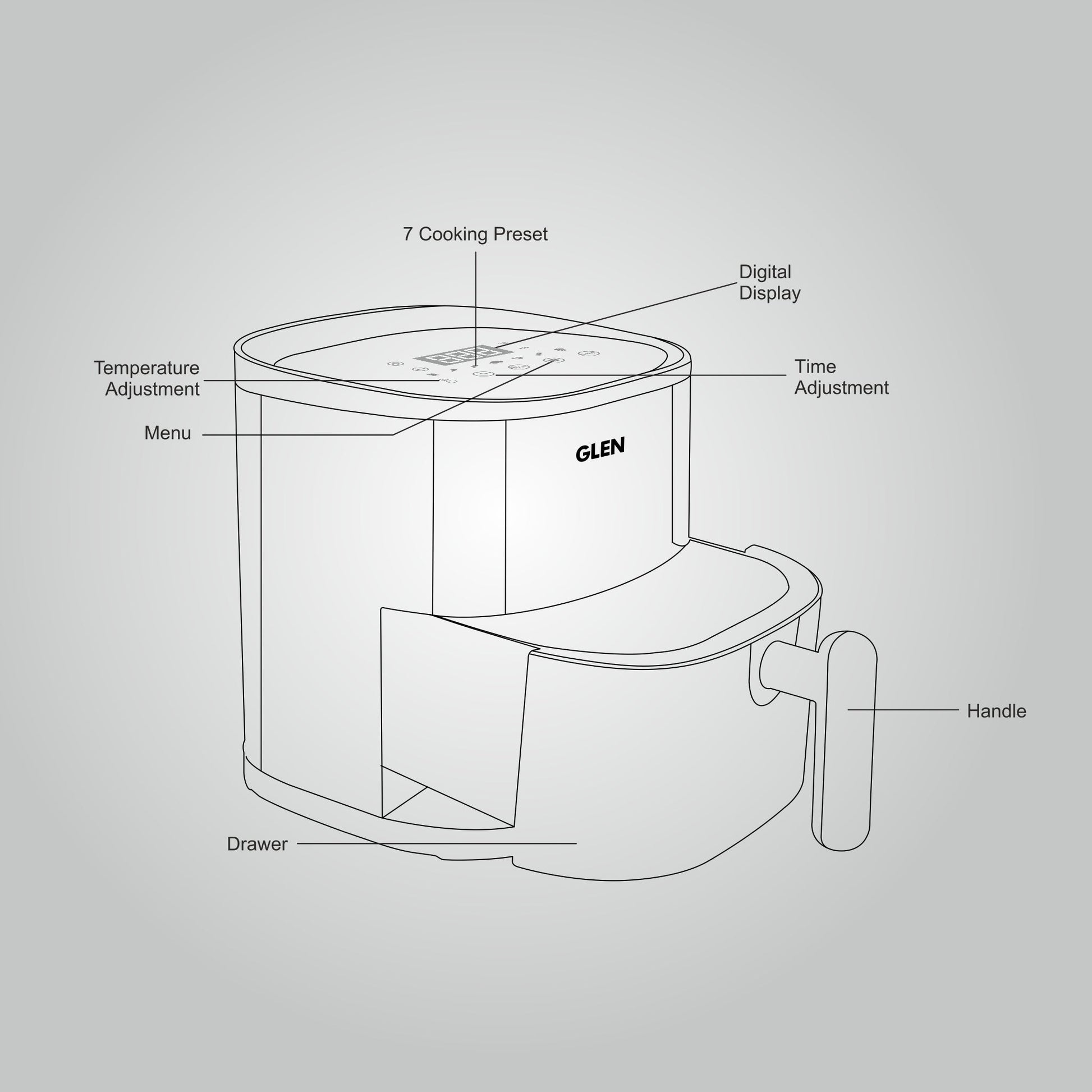 The Glen Digital Fryer circulates ultra hot air around your food, eliminating the need for all the oil you find in typical deep fried foods. The rapidly circulating hot air gets you healthier meals while still bringing you the same crispy on the outside & perfectly moist on the inside results. Crispy french fries, vegetables, chicken, fish and more all at your finger tips with the convenience of easy clean up and no oily mess. The Digital fryer is built to anticipate all of your air frying, reheating and dehydrating needs. It also comes with a crisping plate.