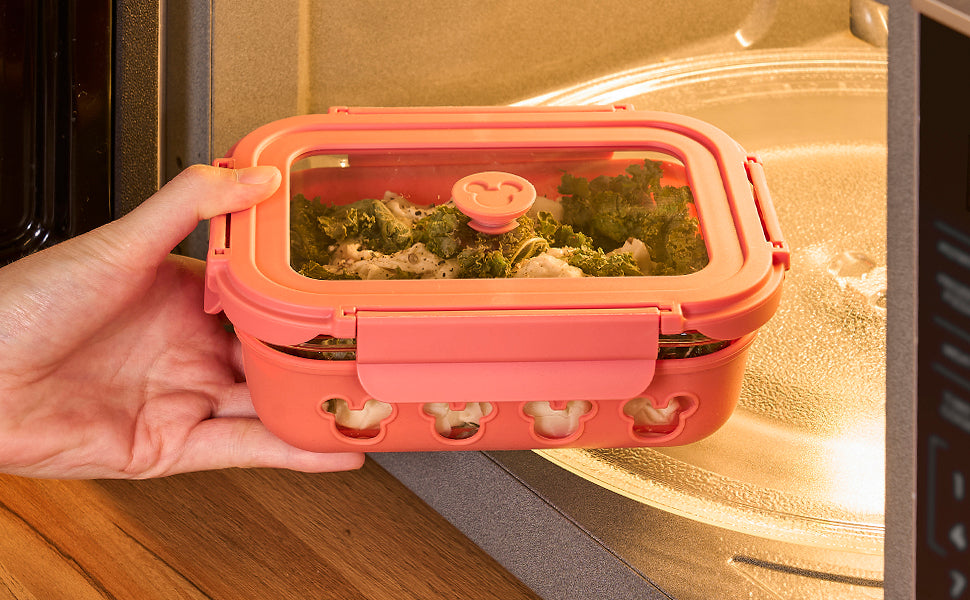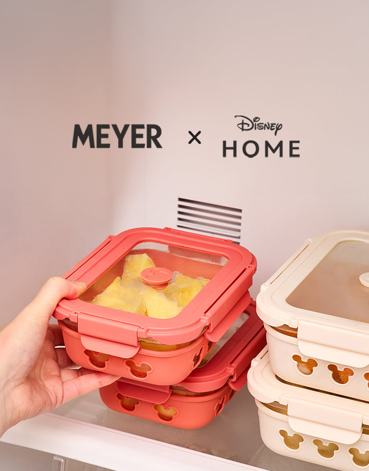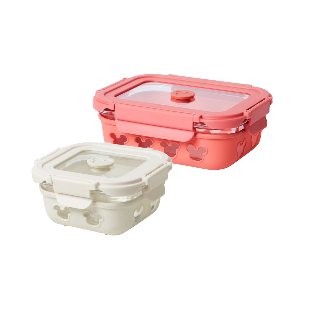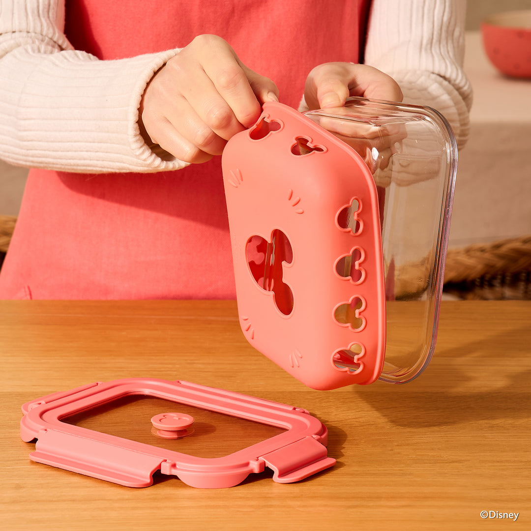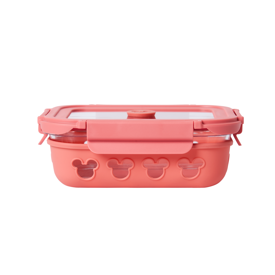 Combining a stylish and functional design with everyday durability, these borosilicate glass containers feature a protective silicone sleeve and a charming Mickey-head air vent. Designed for versatility, they are microwave, oven, and dishwasher safe, offering a leak-proof seal and a long shelf life. The collection includes space-efficient options like the 640ml Off-White and Pink rectangle containers, as well as a compact 320ml small square version, all engineered for secure, stylish, and organized food storage.
