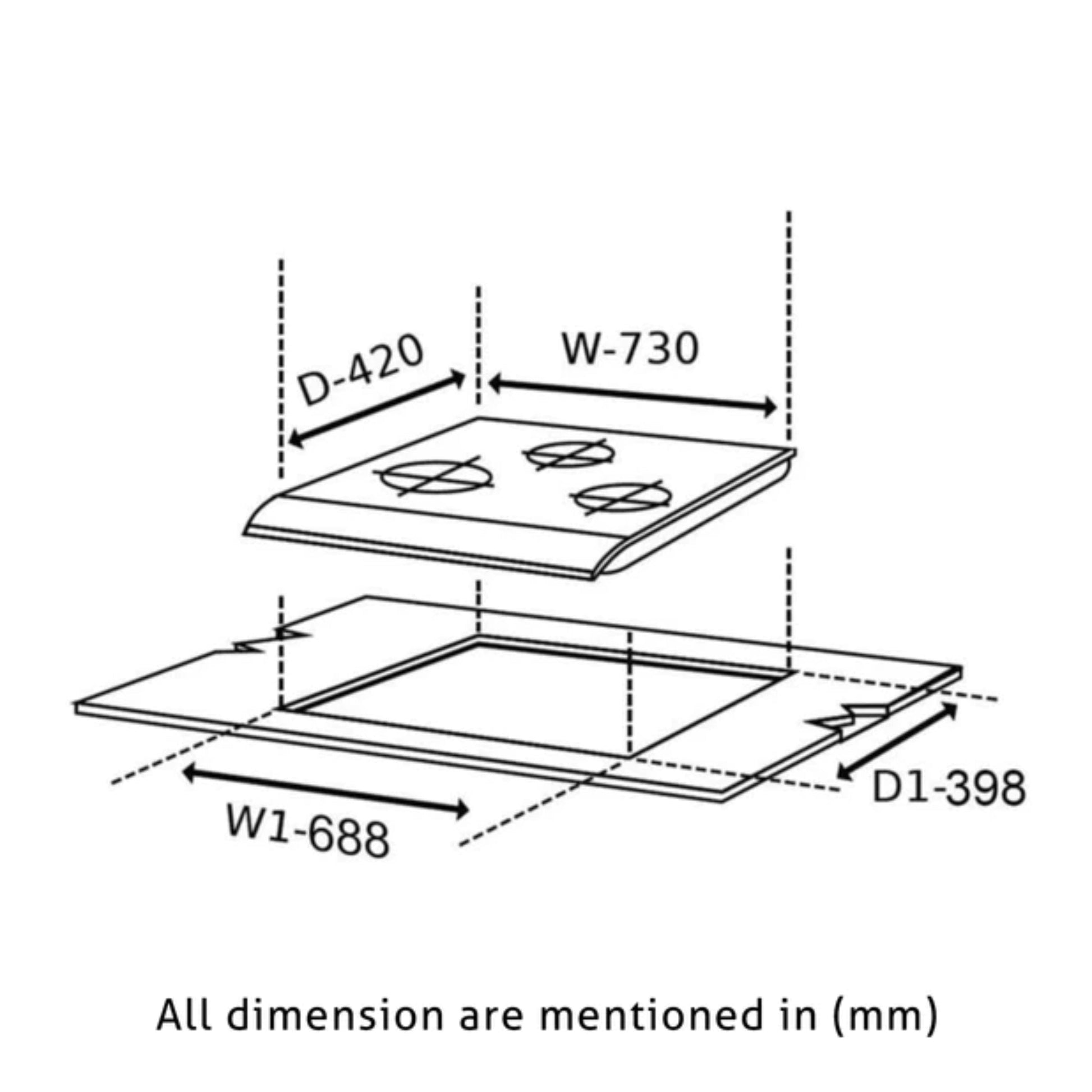 3 Burner Built in Glass Hob with Italian Double Ring Burners Auto Ignition (1073 SQ IN)