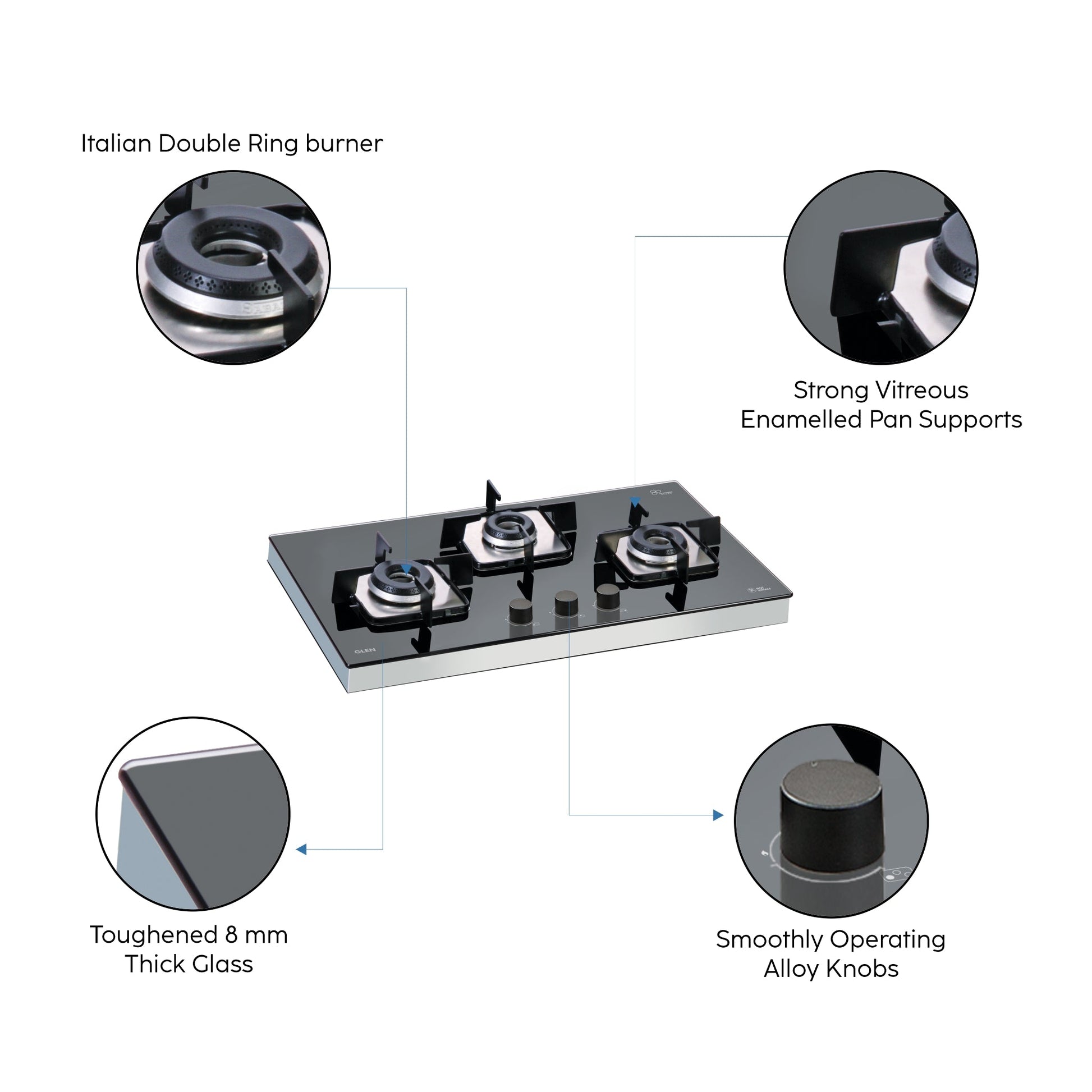 3 Burner Glass Hob Top SS Frame Italian Double Ring Burner Auto Ignition (1073 SQF IN)