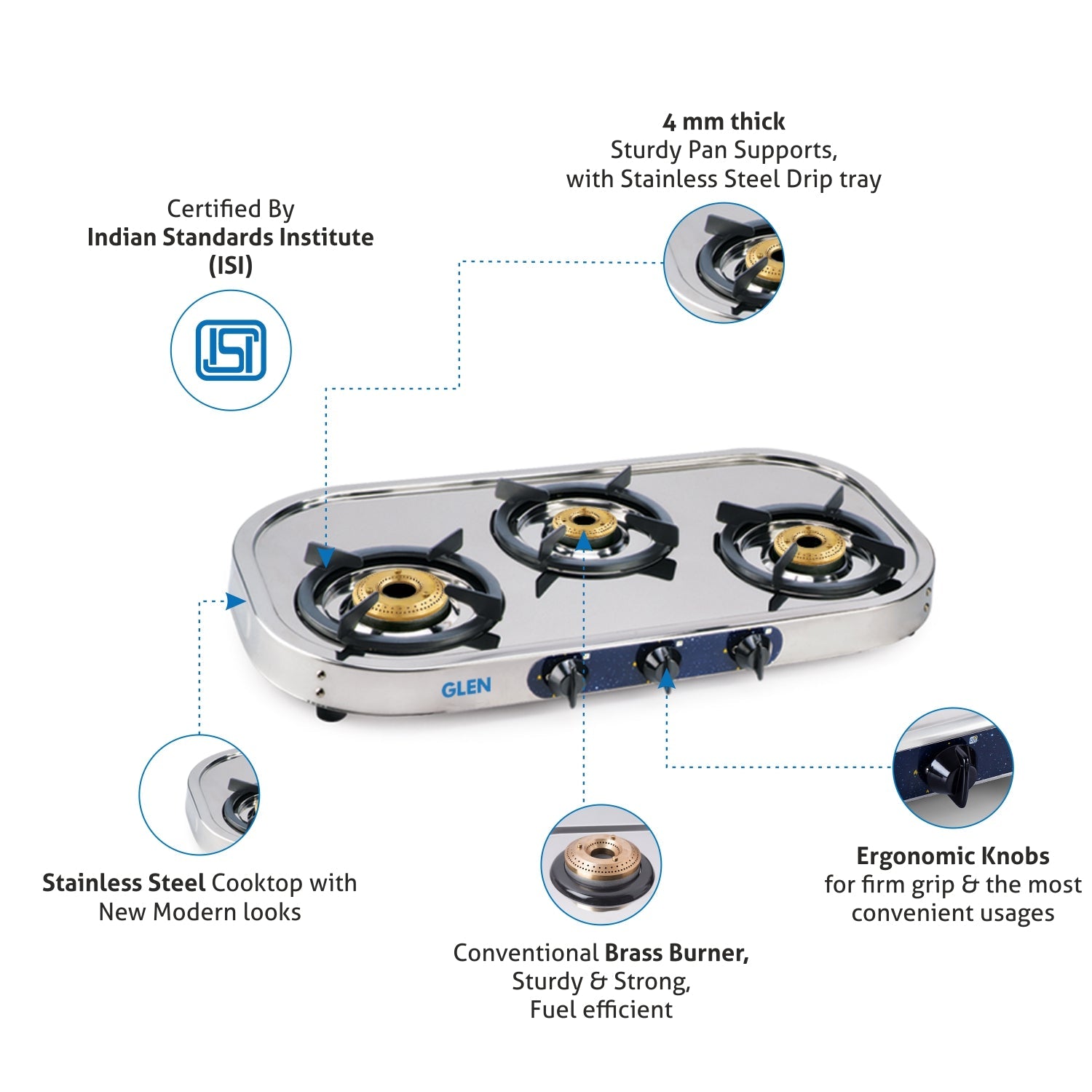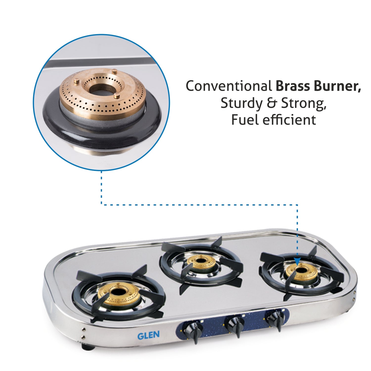 3 Burner Stainless Steel Gas Stove with High Flame Brass Burner Drip Tray (1033 SS HFDT BB)