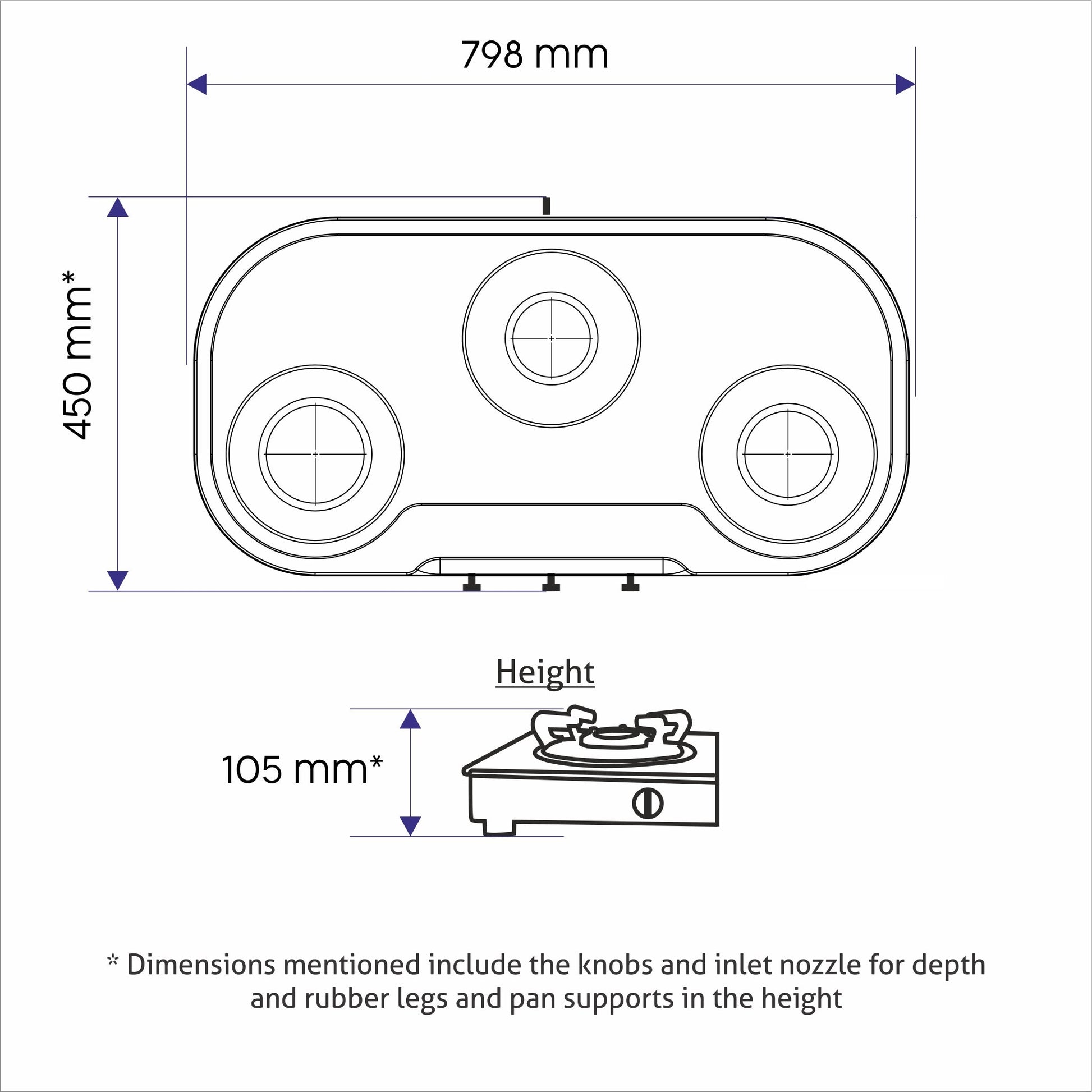 3 Burner Stainless Steel Gas Stove with High Flame Brass Burner Extra Large Drip Tray (1035 XL HF BB DT)