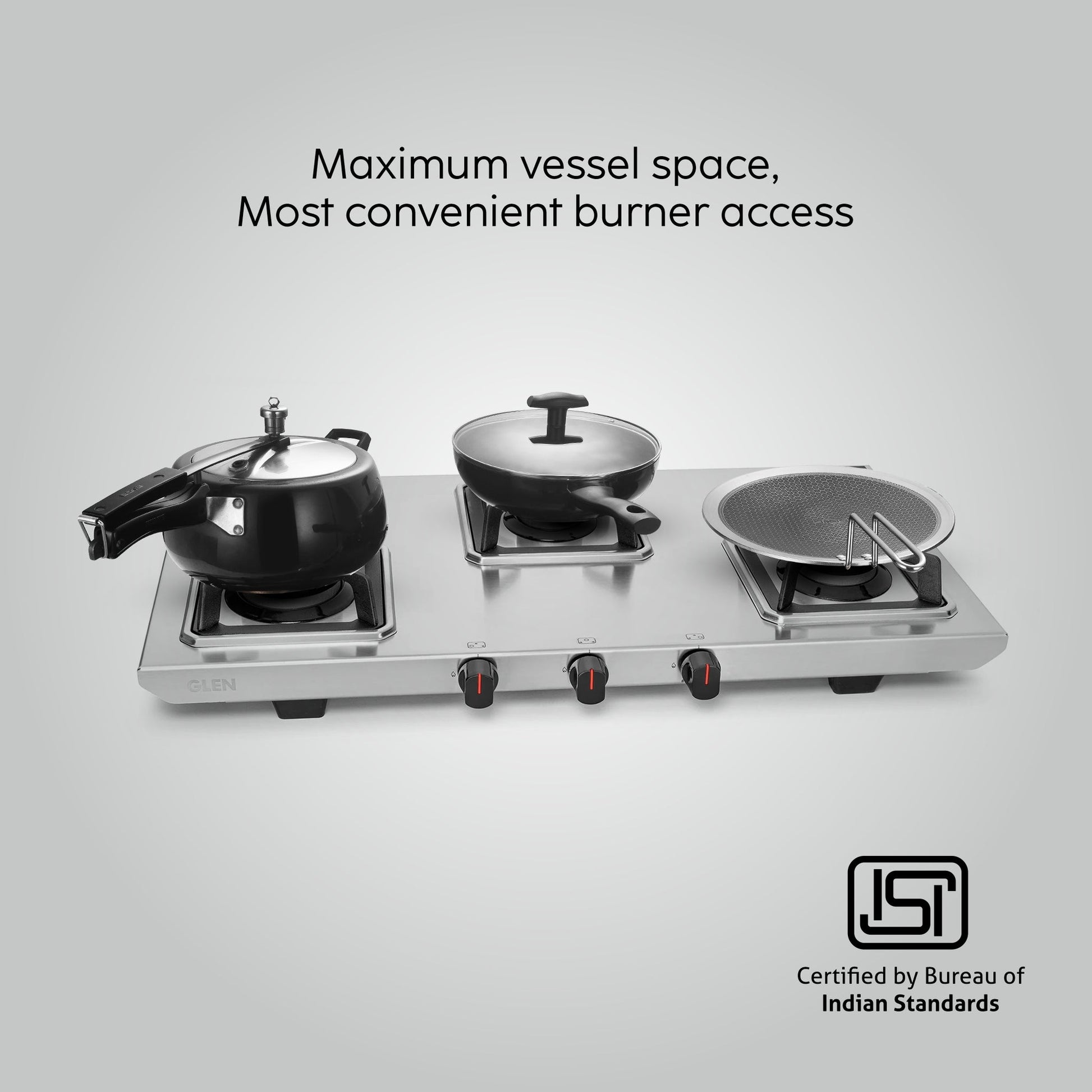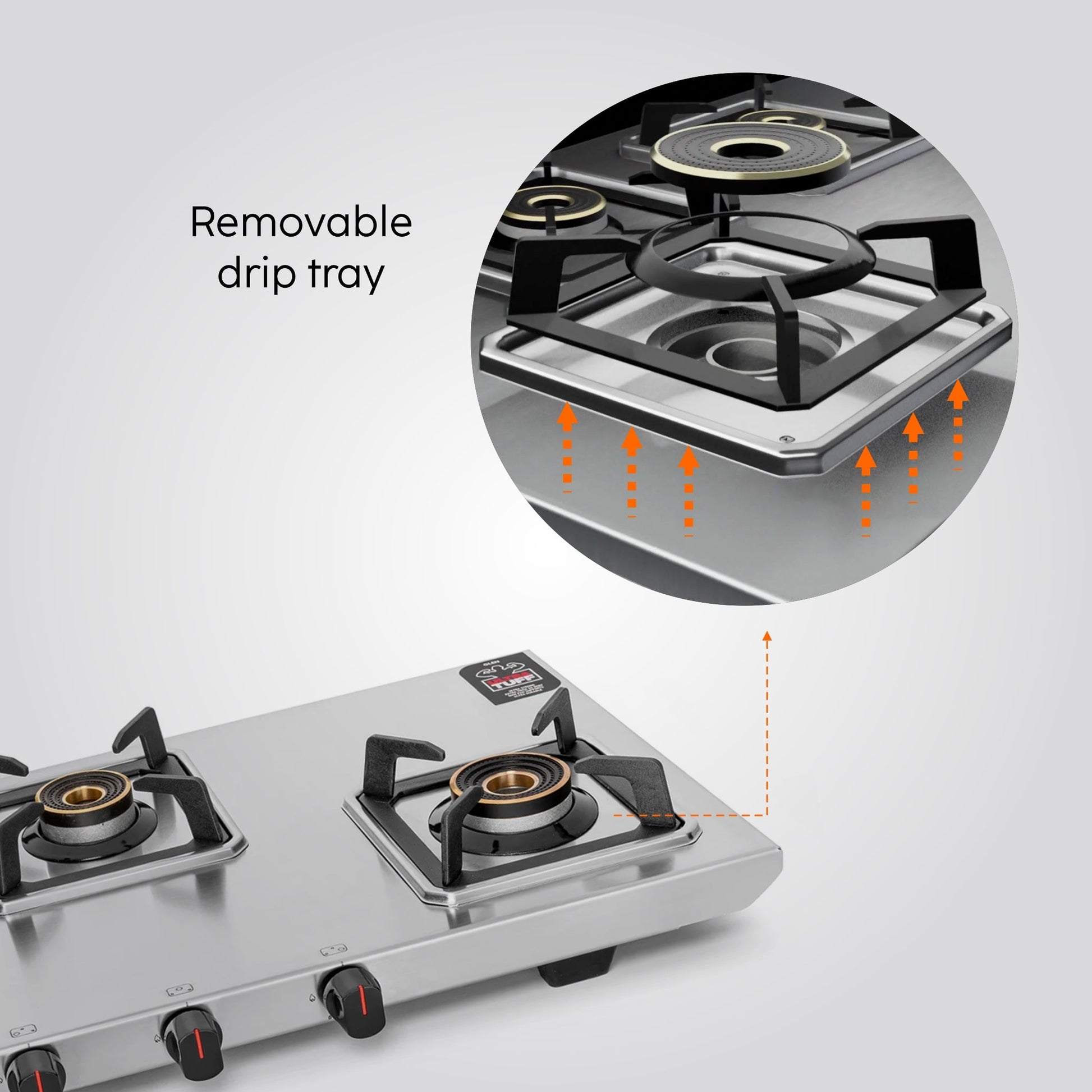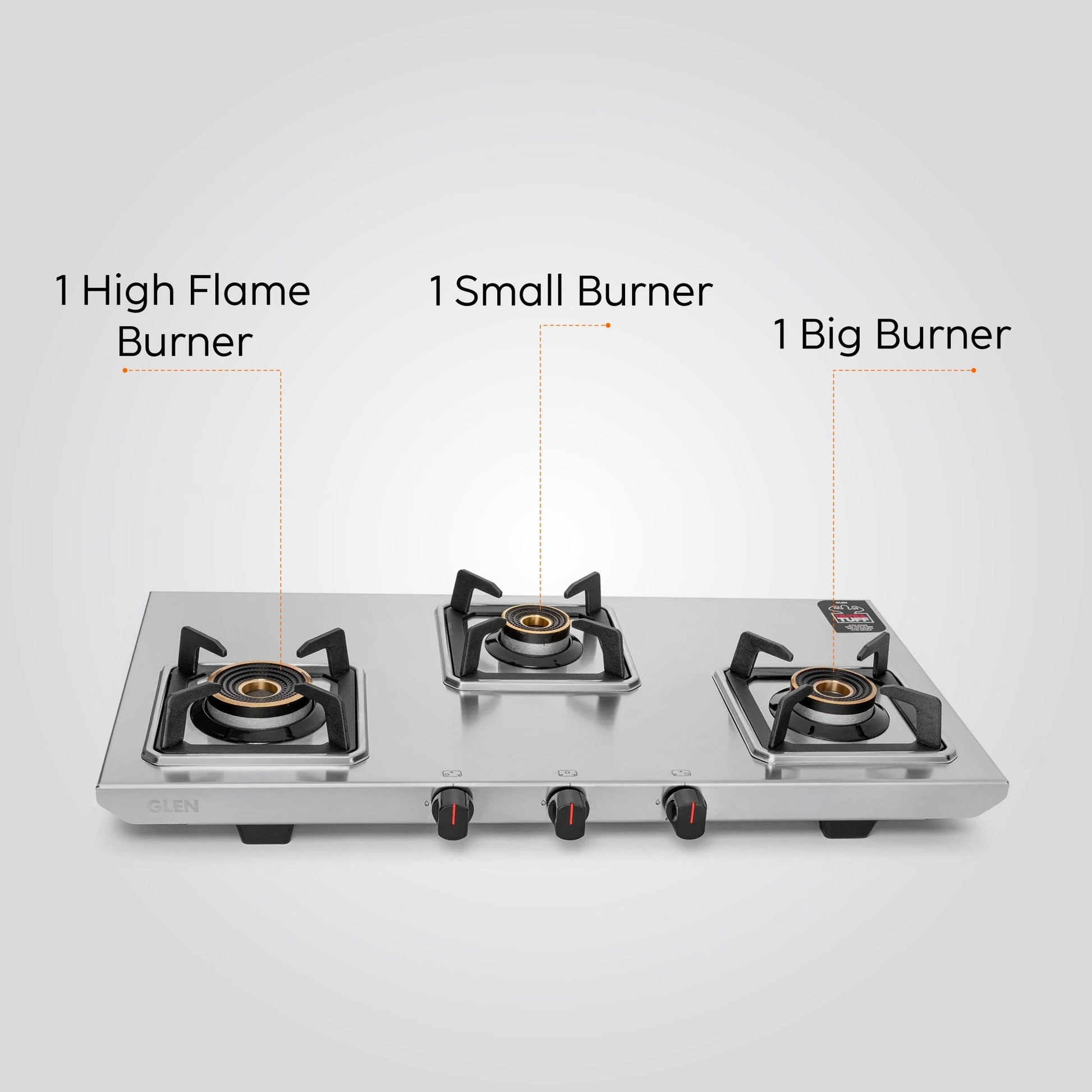 GLEN 3 Burner Ultra Tuff Stainless Steel Gas Stove with Multi Ring Forged Brass Burner & Drip trays (CT1053UTDTSS)