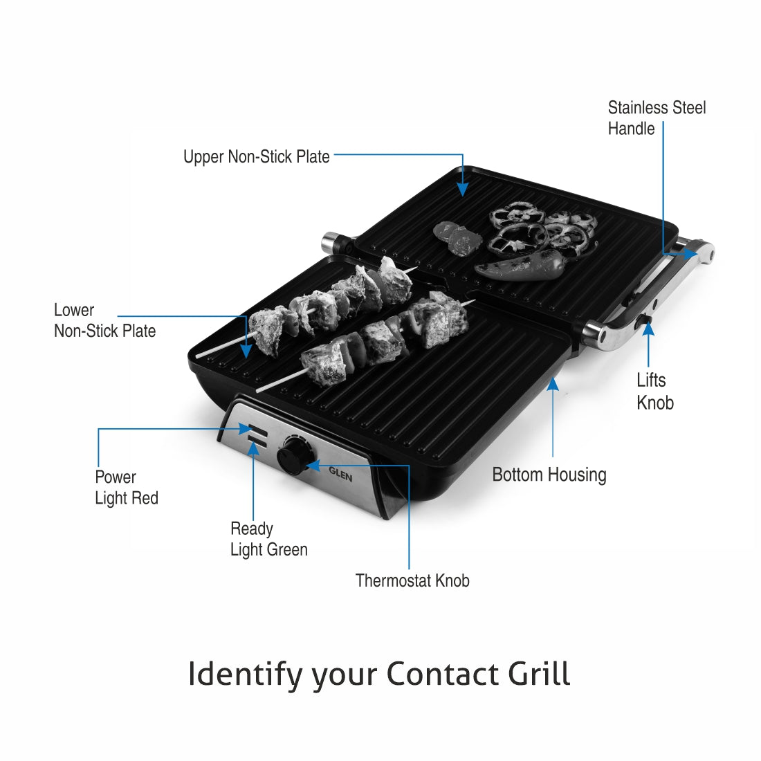 The Glen 3031 Contact Grill lets you prepare great tasting food without using much oil. It comes adjustable thermostat for heat control. It is ideal for cooking & grilling a wide range of foods including vegetables, fruits & meats quickly. The easy to clean non-stick grill plate and oil collector tray allows convenient usage.