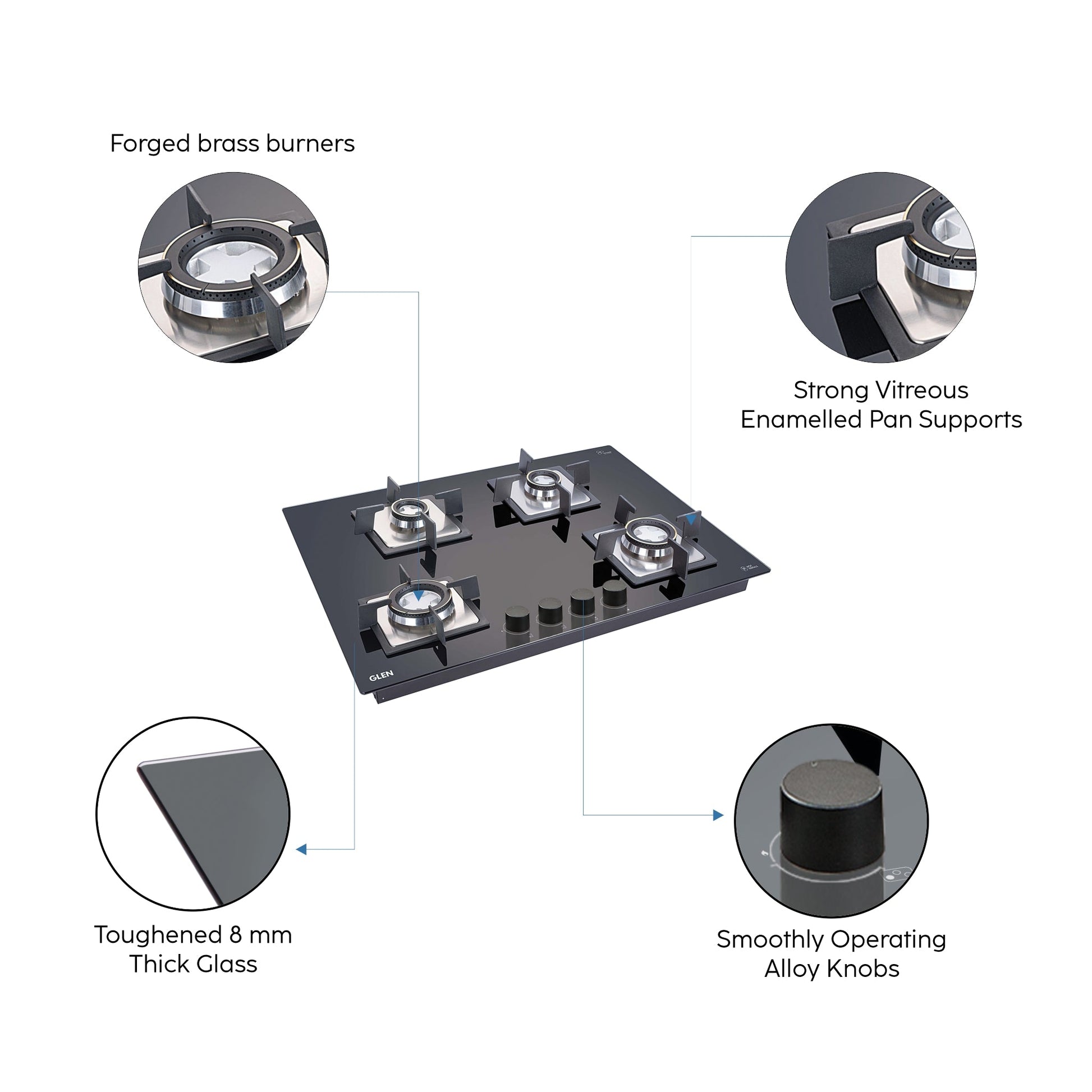 4 Burner Glass Hob Top with Double Ring Forged Brass Burner Auto Ignition (1074 SQ HT DB)