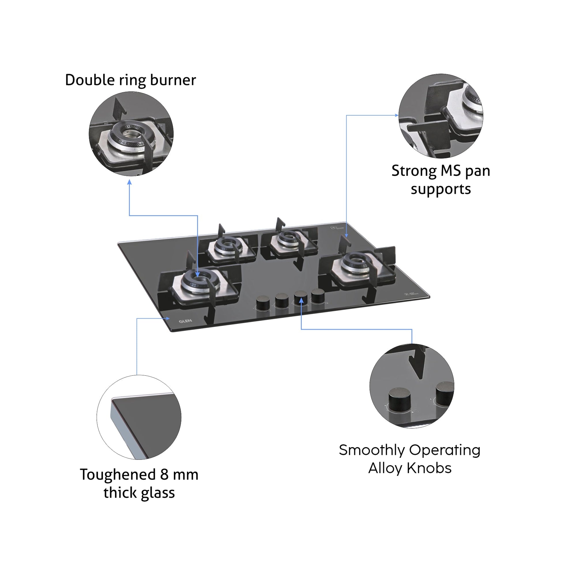 4 Burner Built-in Glass Gas Hob with Italian Double Ring Burner Auto Ignition (1074 SQ IN)