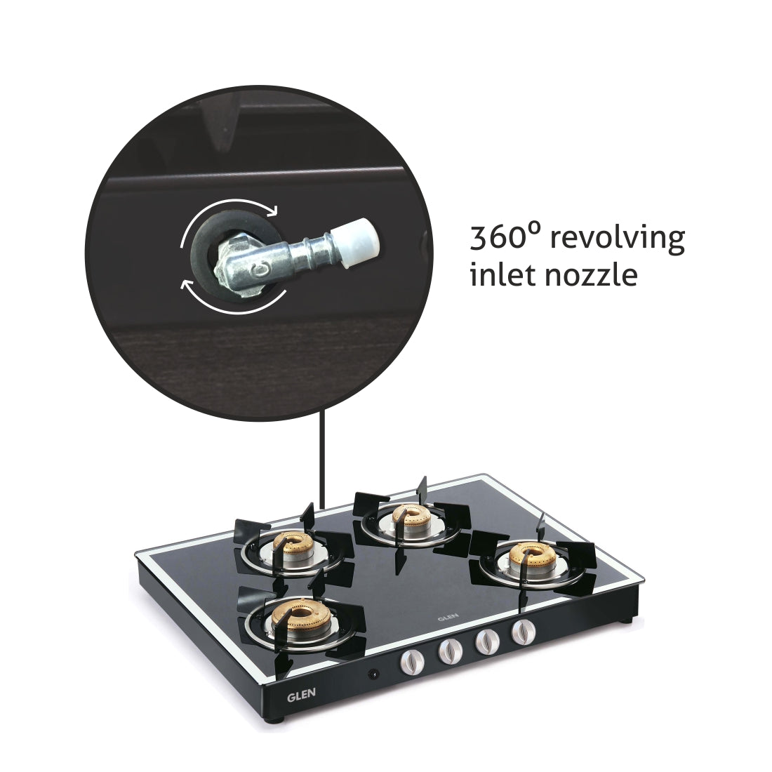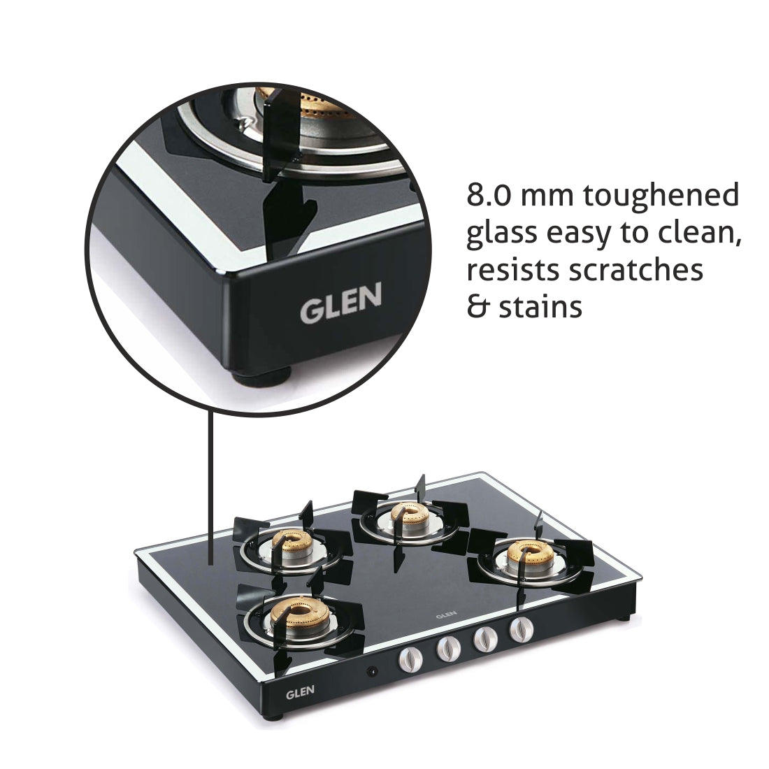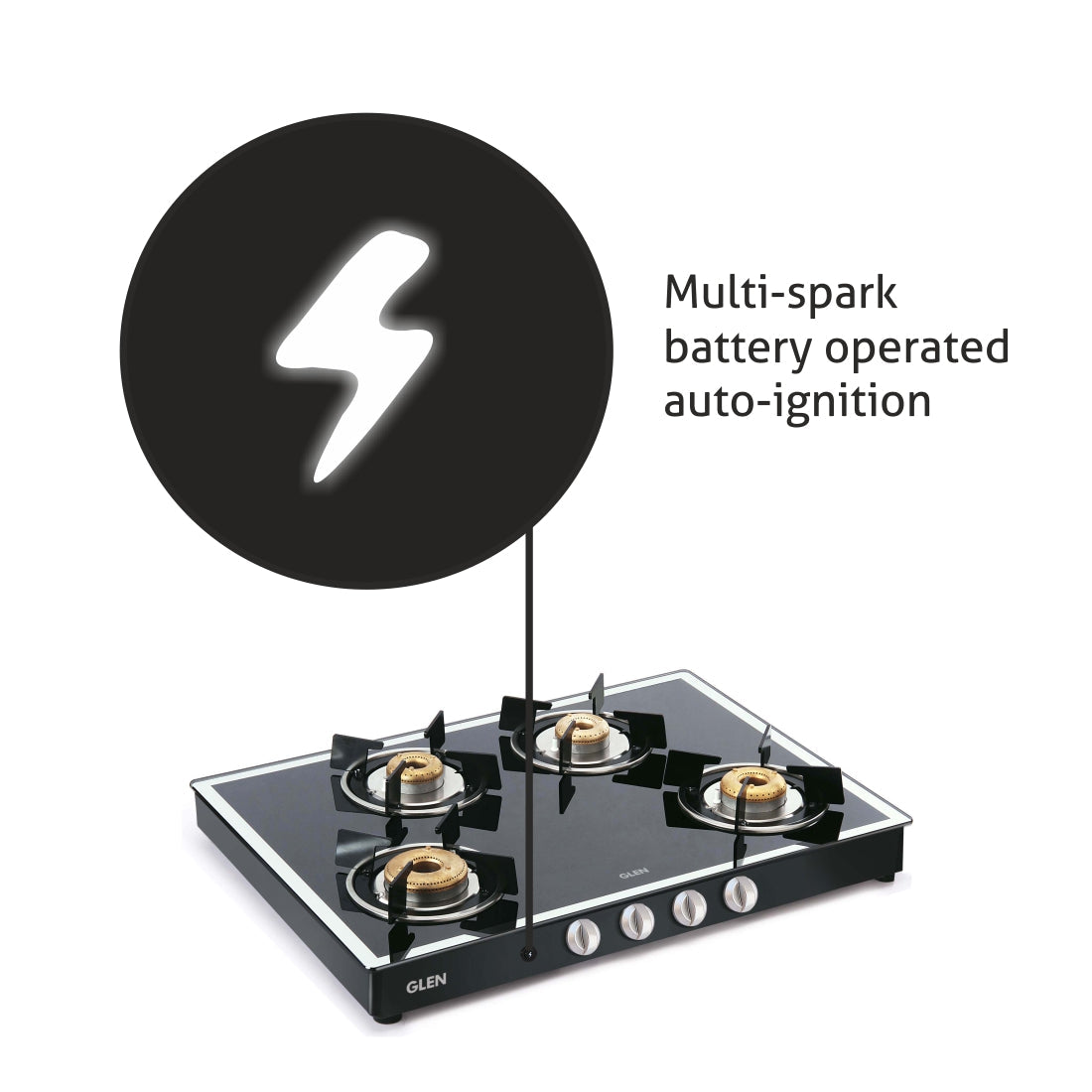 An auto ignition operated gas stove equipped with 4 DifferentB forgedB brass burners: 1 High flame, 1 Big and 2 Small Burner for diverse cooking requirements.B