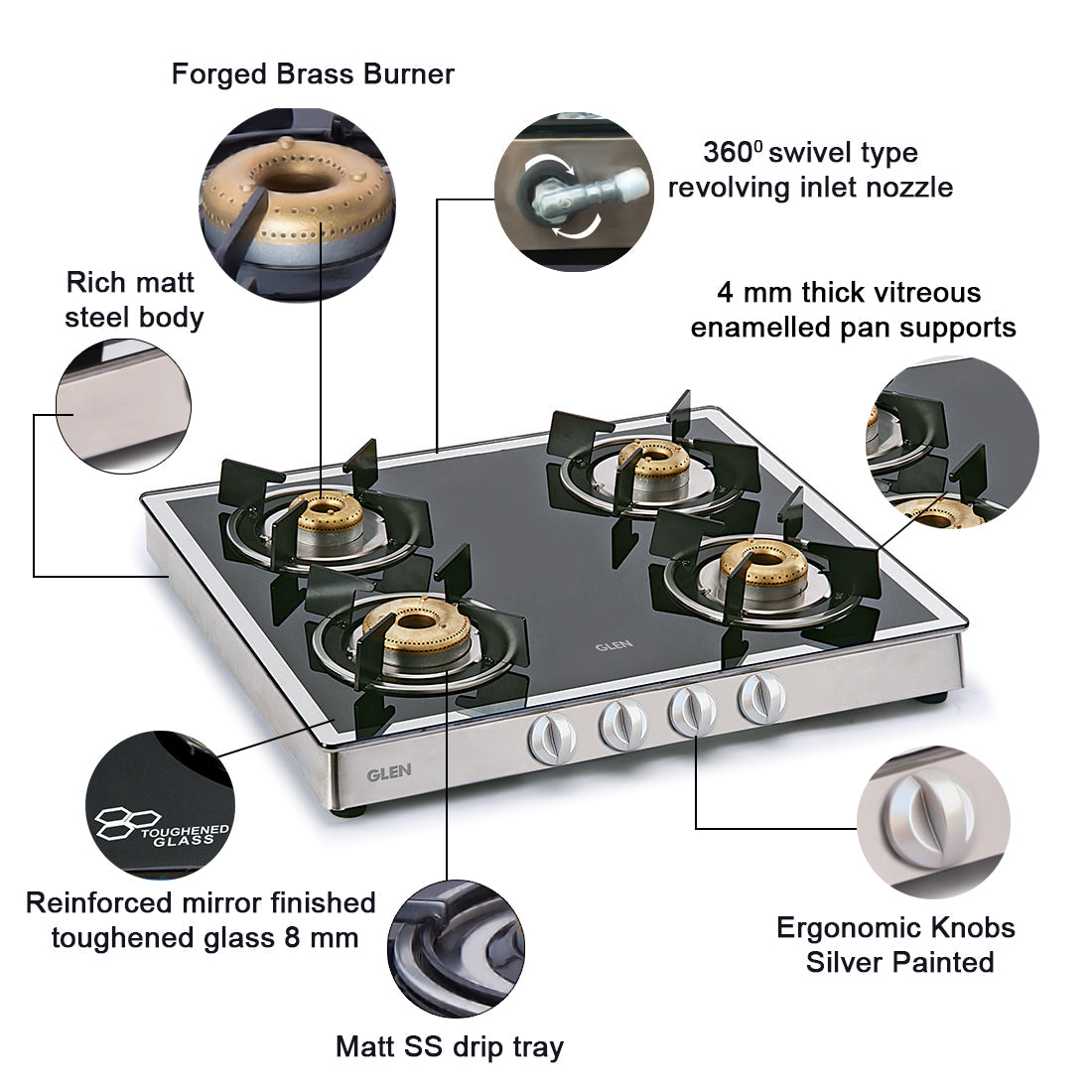 4 Burner Glass Gas Stove Mirror Finish 1 High Flame 3 Forged Brass Burner 60 CM (1042 GT FBM)