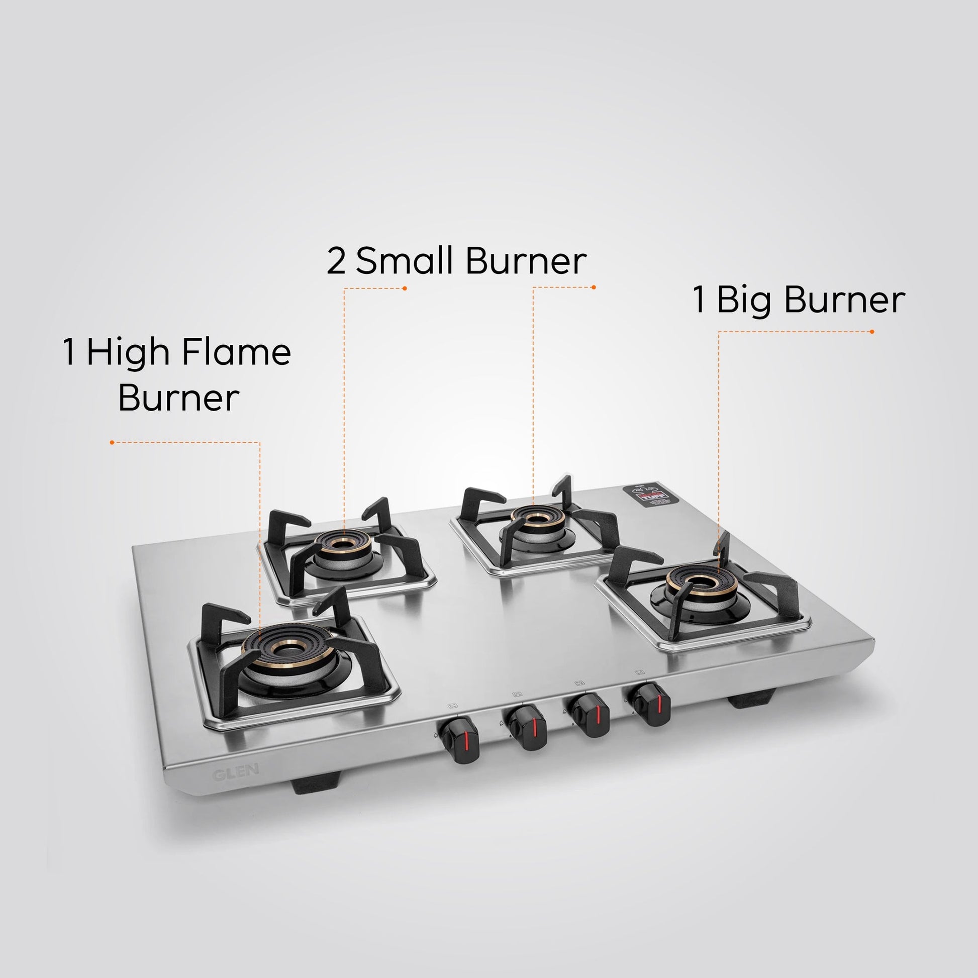 - Equipped with 4 Different Multi Ring Forged brass burners: 1 high flame, 1 big and 2 small burner for diverse cooking requirements.