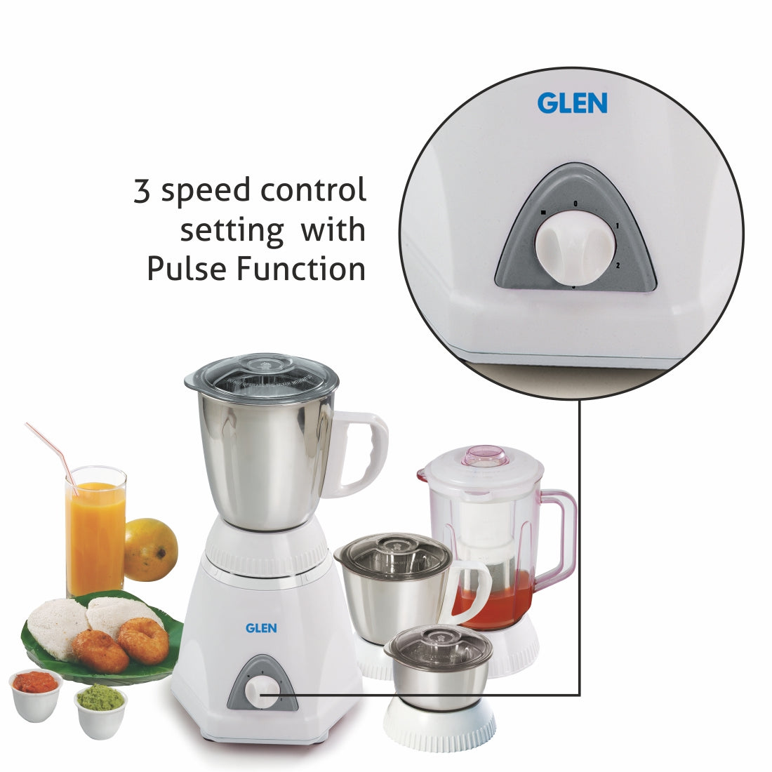 TheB Glen 4026 Plus Mixer GrinderB is quick enough to make all your pre-cooking requirements convenient. Equipped with 750 W heavy duty motor, it is perfect for grinding dry spices to soaked rice & dals for making batters and pastes, you can also prepare smoothies and shakes. The 4 different jars including liquidizer, blenderB with fruit filter, dry grinder and chutney jarB minimizes your efforts and also save your time. The 100% Copper wire motor handles heaviest loads. Also, the overload protector is enabled to prevent motor damage.