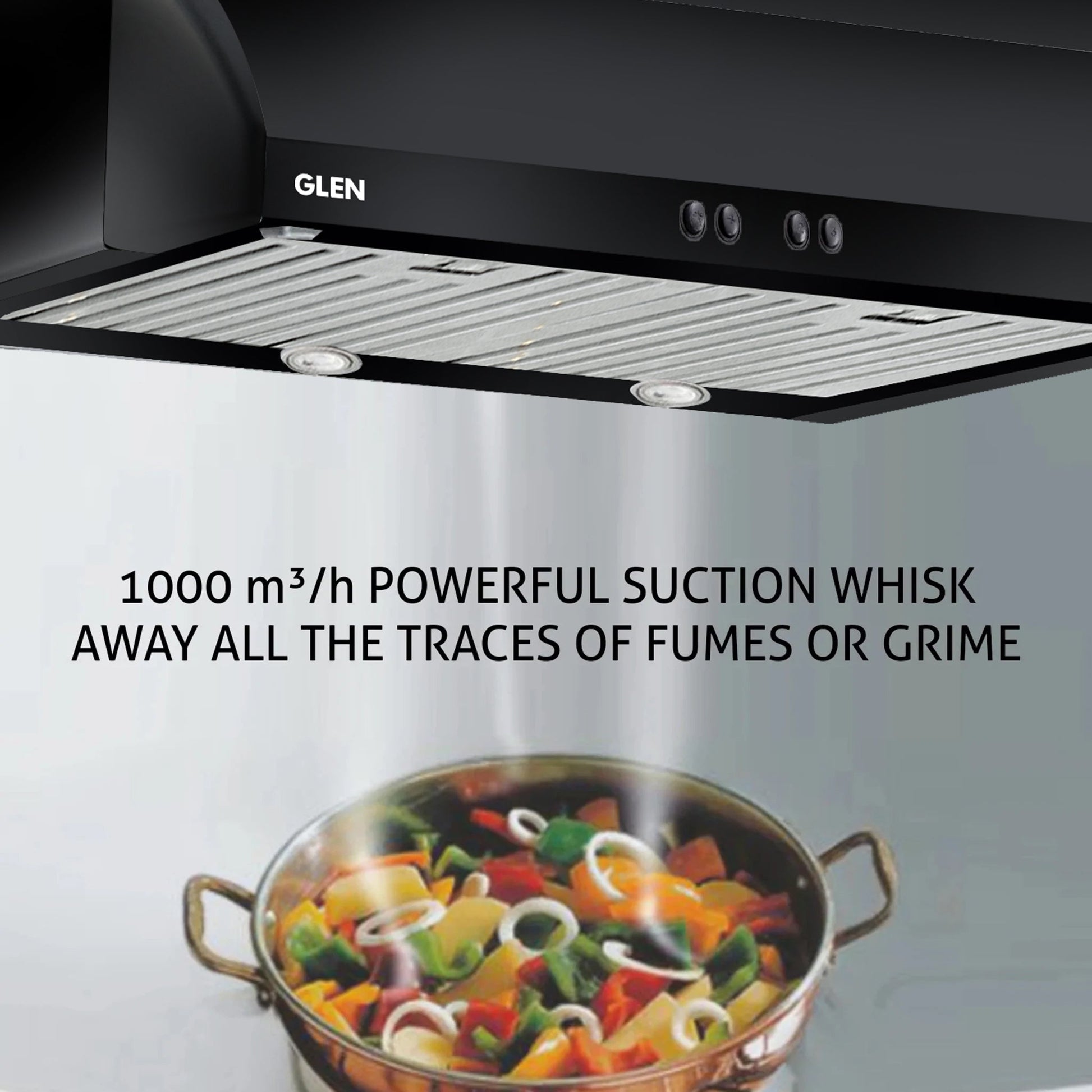 The Glen 6014 is an advanced design straight line chimney having stainless steel baffle filter which can be conveniently removed and replaced after cleaning. It also has bi-rotational technology where two motors rotate in opposite direction in order to create low pressure zone, which results in higher flow. The motor with Thermal Overload Protector ensures that in case of overheating, the motor does not burn out.B