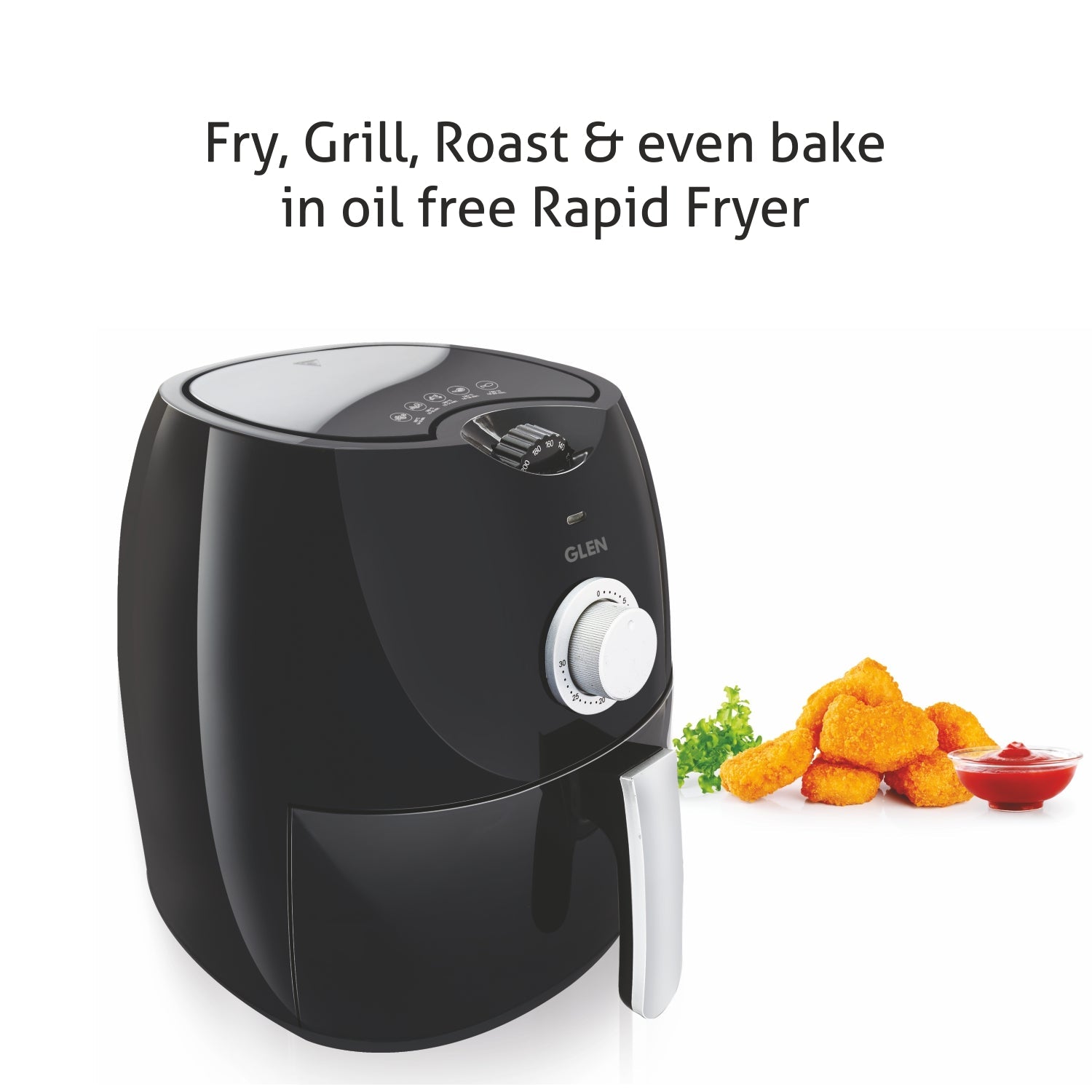 TheB Glen 3044B rapid fryer is a healthy alternative to prepare deep fried foods. A 2.8 Litre capacity air fryer for frying, baking, grilling & roasting conveniently using little or no oil. It comes with powerful 1350W motor for swift circulation of hot air. Having big stainless steel coil, it allows rapid heating. The vapour steam and cool touch handle are also one of the smart features.