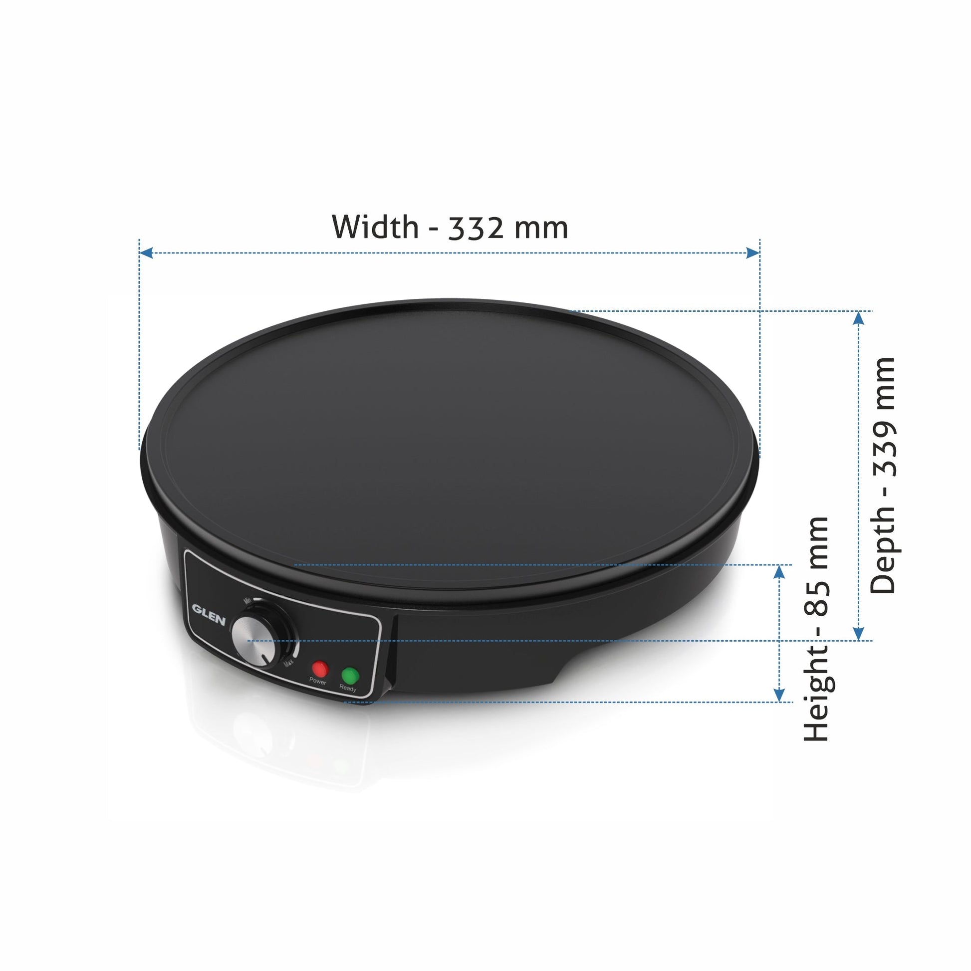 Prepare a variety of dosa, chilla, pancakes, crepes, parantha, uttapam, omelettes and many more dishes with this Glen Dosa Maker having cooking area of 30cm. 1400W Comes with adjustable temperature control to set the heat as per the dish being cooked | The power & ready indicator lights let you know the status of cooking.