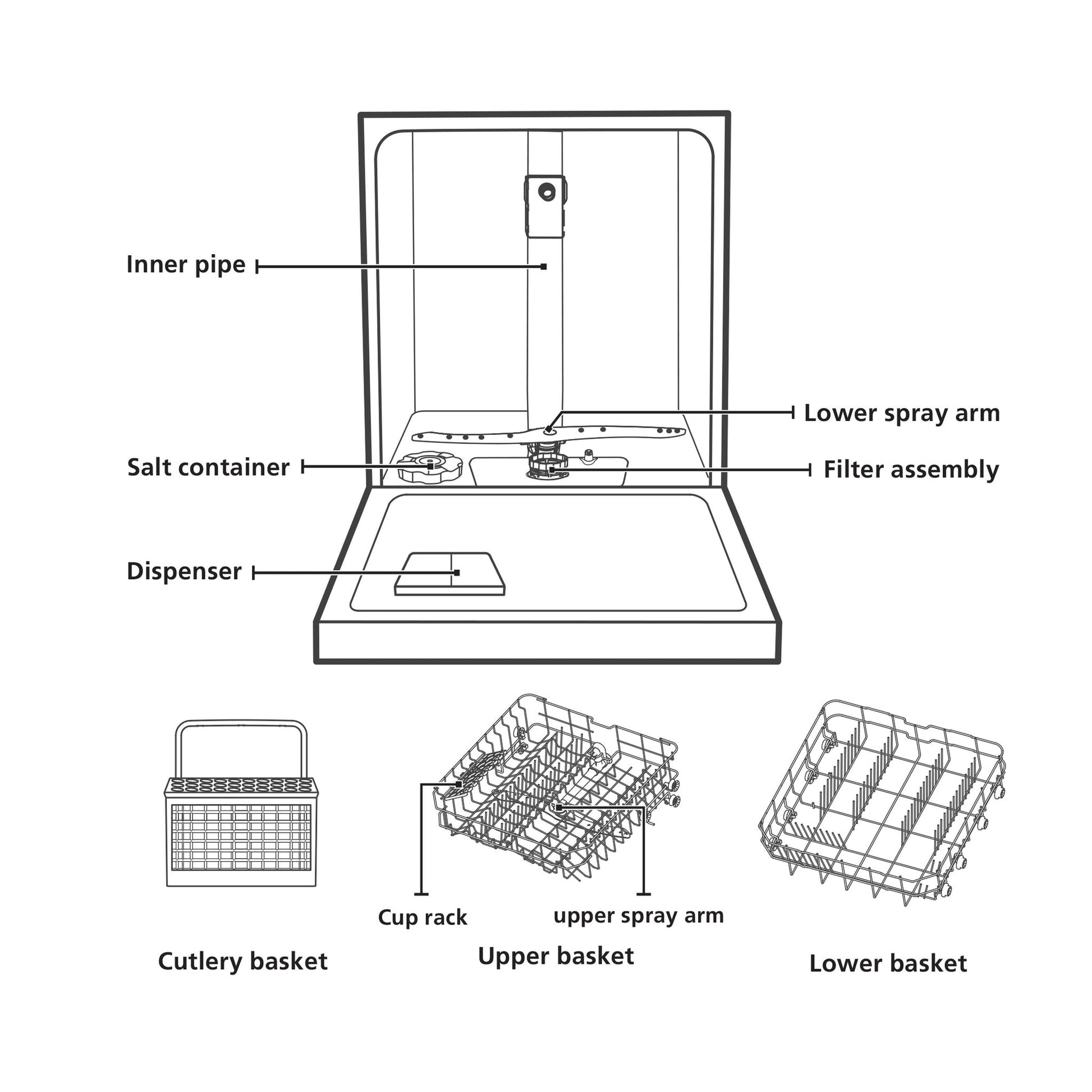 - Functions: on/off, program, half load, child lock, delay, start/pause