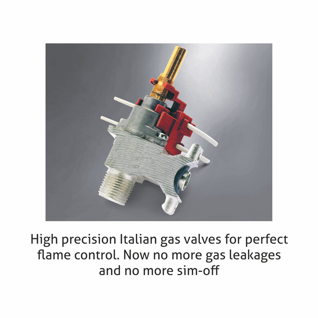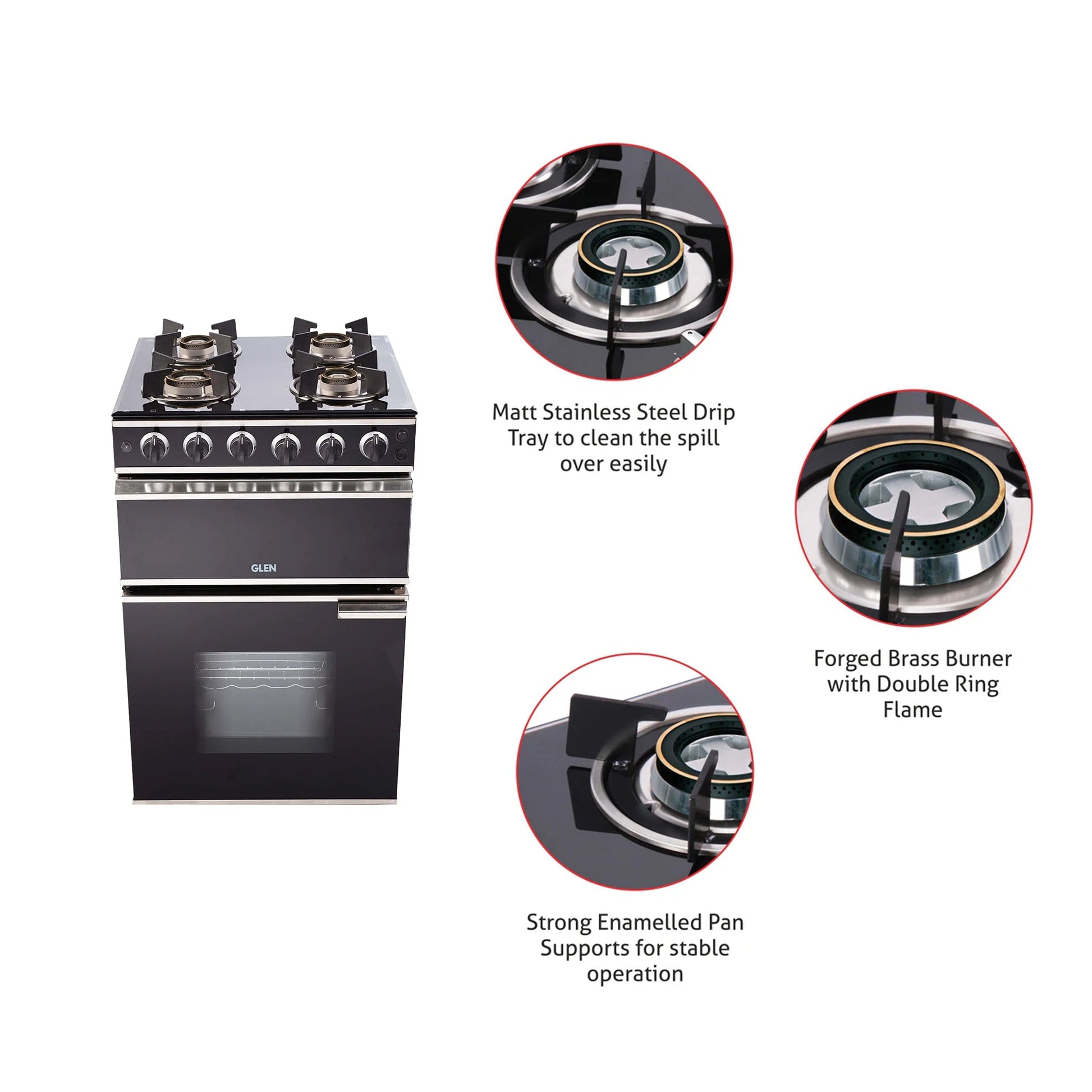 The Glen 2014 cooking range with 4 double ring burners is a classic addition to your modern kitchen. There are 2 big B and 2 small forged brass burners. It comes in stainless steel sides with 8 mm thick toughened glass top. It has strong enamelled pan supports to accommodate heavy utensils easily. It also has matt steel drip tray to clean the spill over easily.B