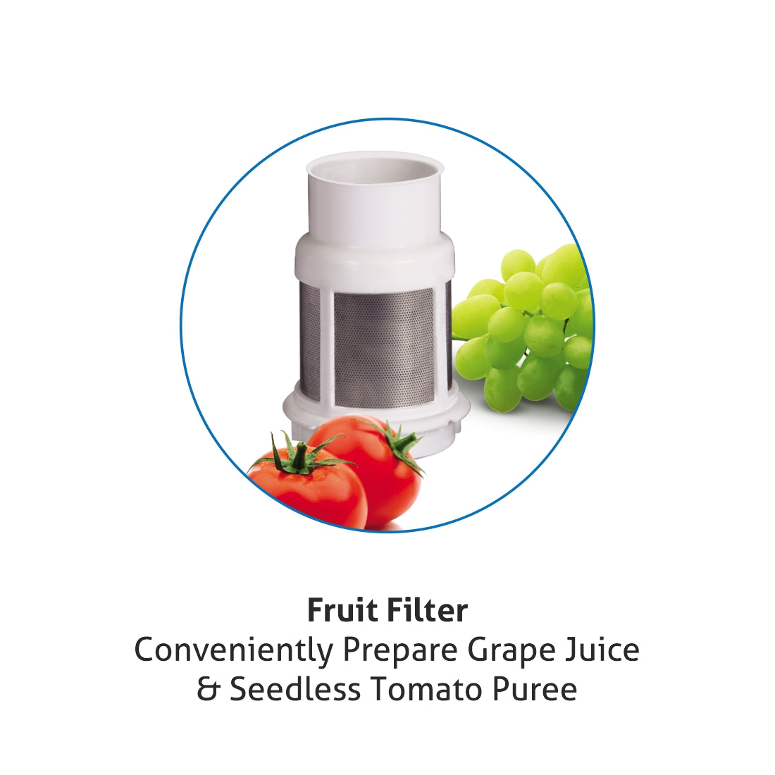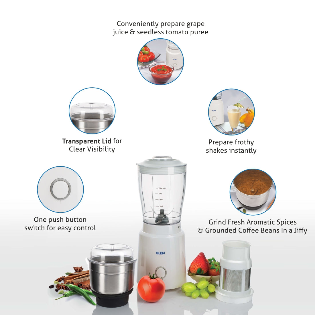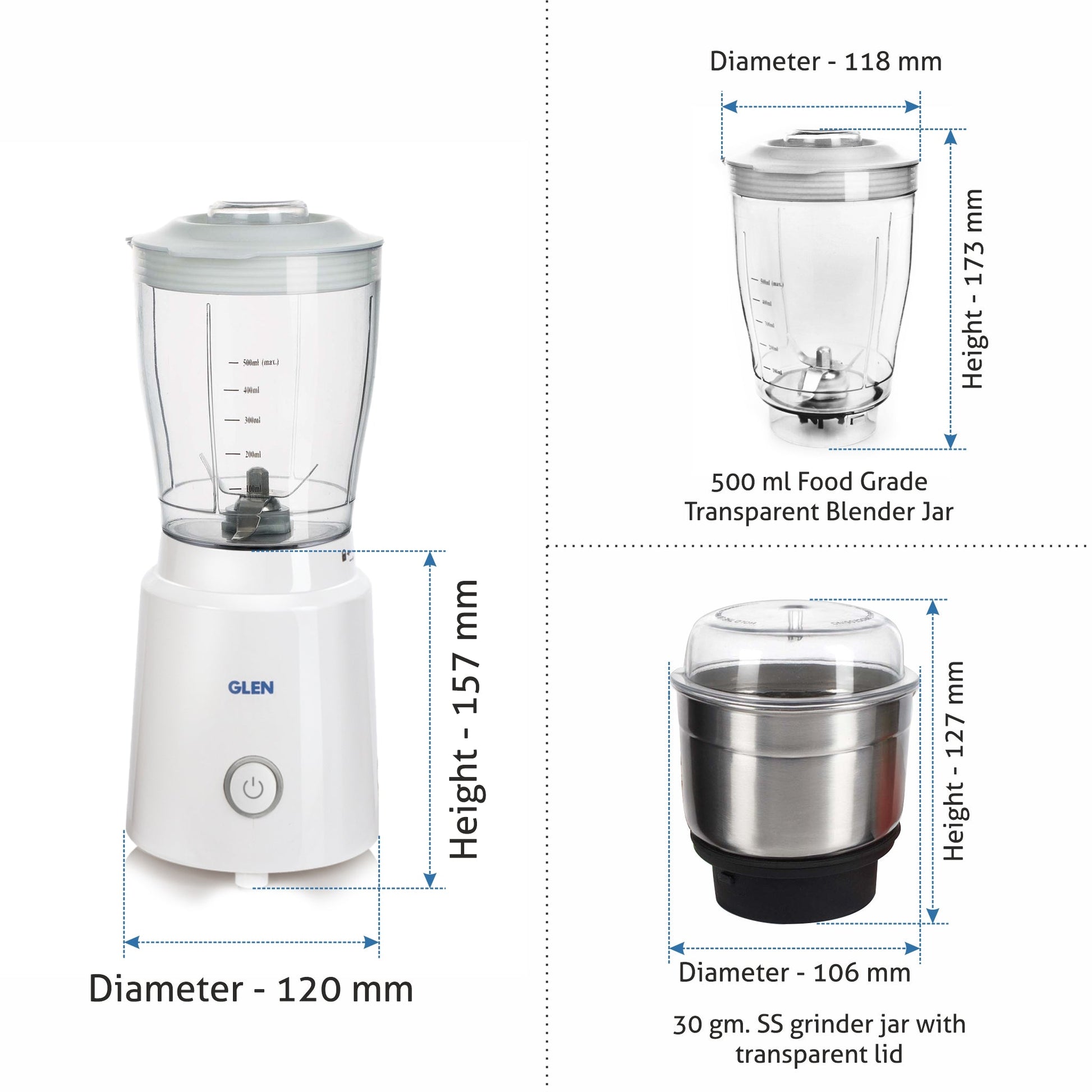 The Glen 4045 N Mini Blender plus Grinder is a compact appliance that can perform all your blending and grinding tasks without any hassles. With 1 blender having fruit filter and 1 grinder jar, it is perfect for processing of various foods. From preparing grape juice, seedless tomato purees and shakes, you can also grind fresh coffee beans. The 350W powerful motor completes all tasks in a jiffy. The push start button with single speed allows trouble free operation.
