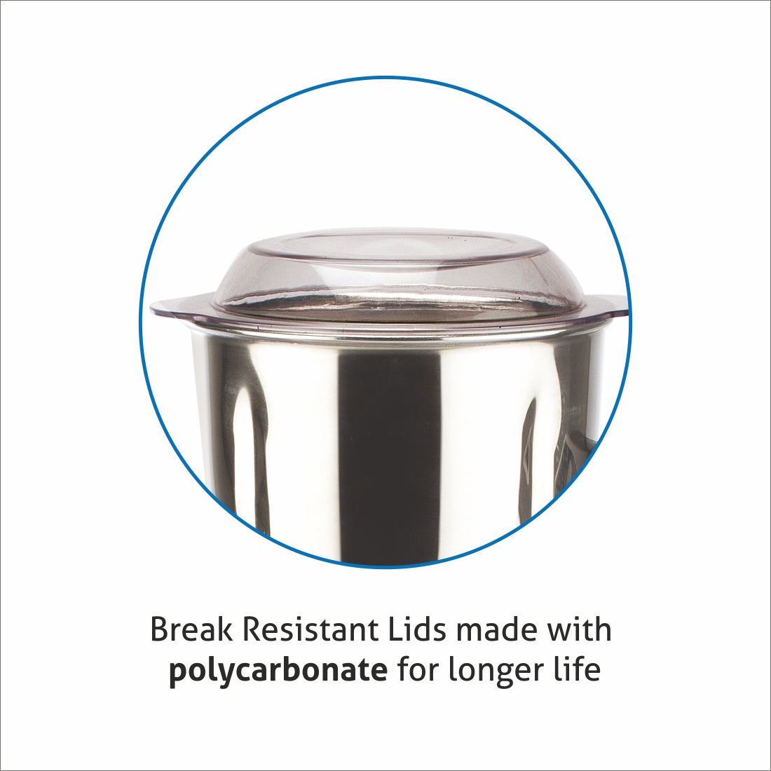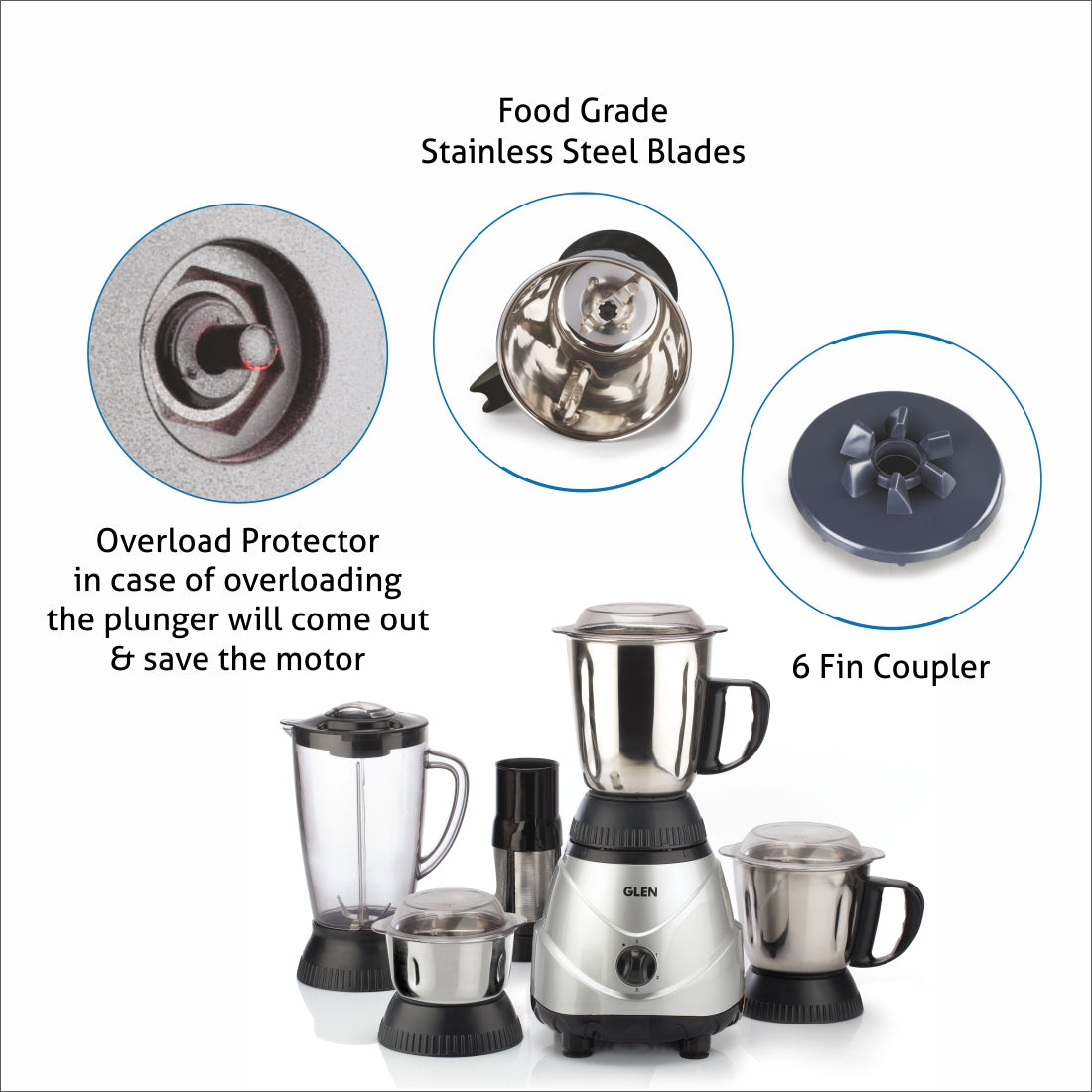 The Glen 4022 Platinum Plus Mixer Grinder is a strong appliance to make all your pre cooking requirements convenient. From grinding dry spices to soaked rice & dals for making batters and pastes, you can also prepare smoothies and shakes. The 4 different jars including transparent jar with fruit filter, liquidizer, dry grinder and chutney minimizes your efforts and also save your time. High power 750W motor allows grinding of toughest whole spices, coffee beans, rice, sugar, turmeric, wheat etc. and achieve the finest of results. The motor has Locked Power of 2200W and comes with 5 yearsb warranty. Also, the special oil seals prevents any kind of leakage from the appliance.