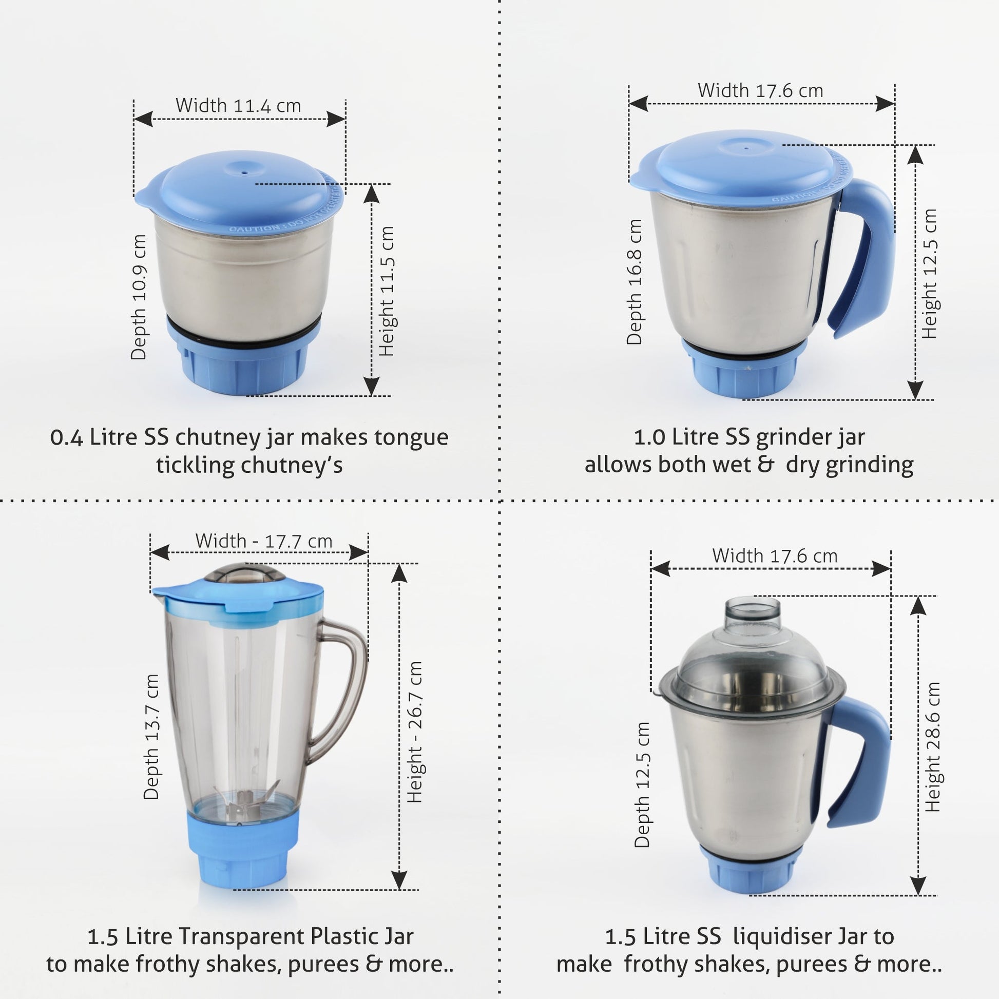 Mixer Grinder 750W with 1 Transparent Jar 3 Stainless Steel Jars - White & Blue (4023 PLUS)