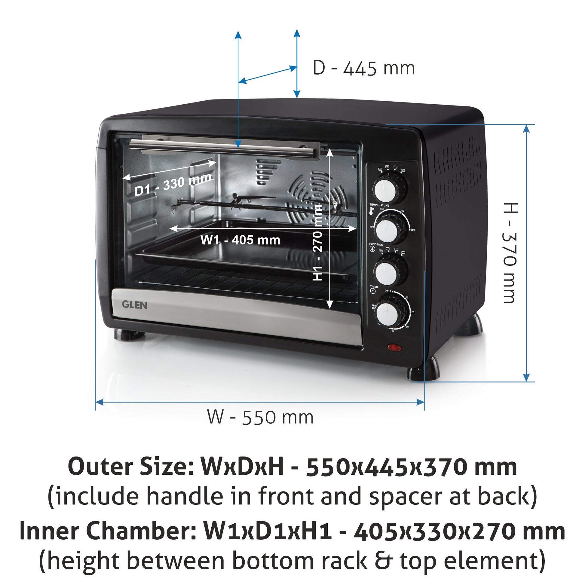 The Glen 5048 Oven Toaster Griller comes in metallic black finish. It is a multi function appliance that can do all types of cooking except stove cooking. It lets you prepare lip smacking delicacies like a professional. It comes with thermostat to control temperature and 60 minute timer to let you know the preparation status of food. The oven light for clear glimpse of interior is an added advantage.