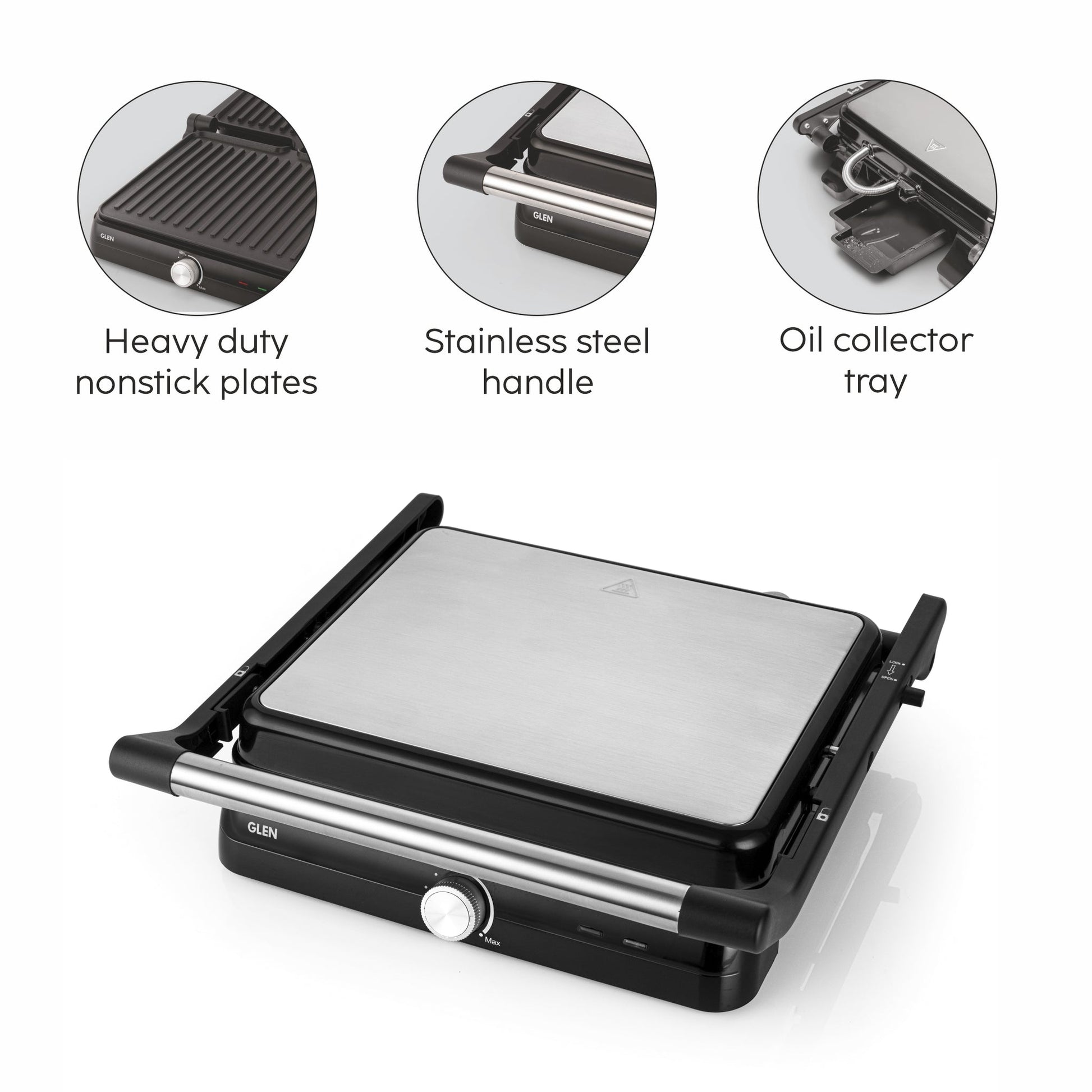 GLEN Electric Contact Grill & Sandwich Maker with 180-degree opening, Non-Stick Plates, 2000w - (SA3031INCG)