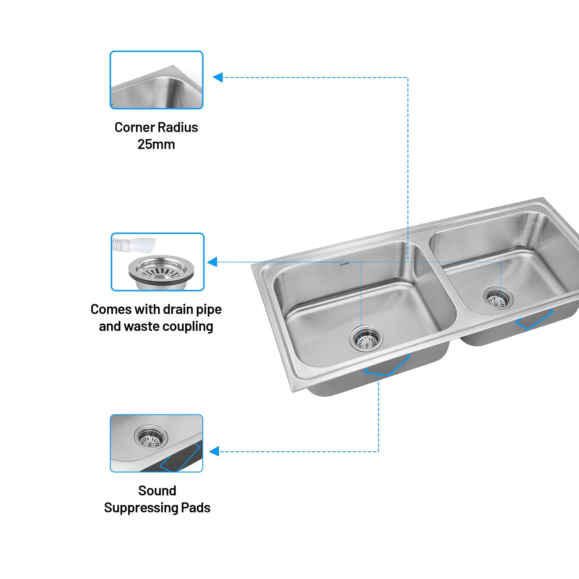 GLEN Stainless Steel Grade 304 Sink for Kitchen | Double Bowl Press Sink 45x20x9 inches | Glossy Finish (KS-SP45209DBG)