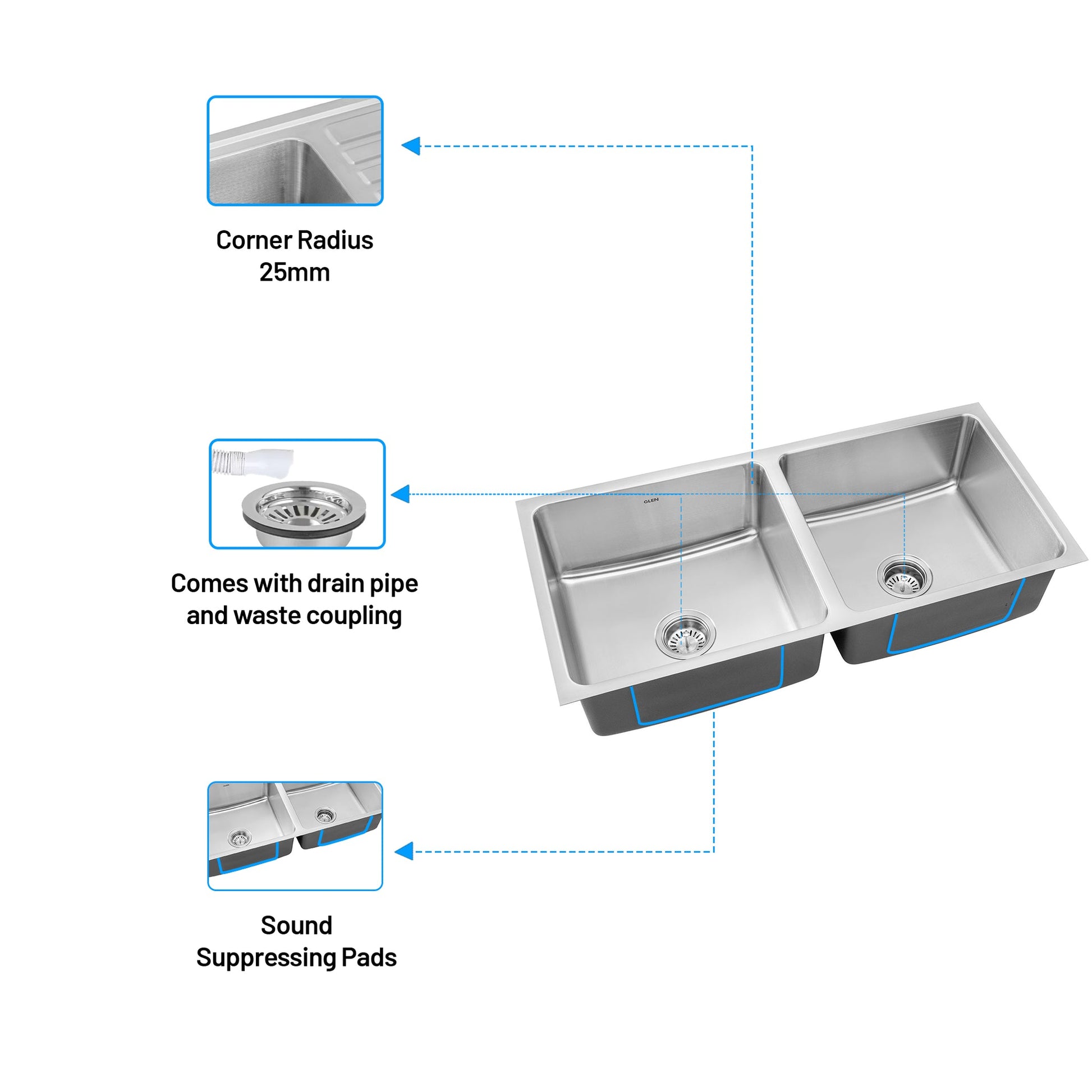 •Convenient Installation: The Glen Kitchen Sink comes complete with a drain pipe and waste coupling, ensuring a hassle-free installation process.