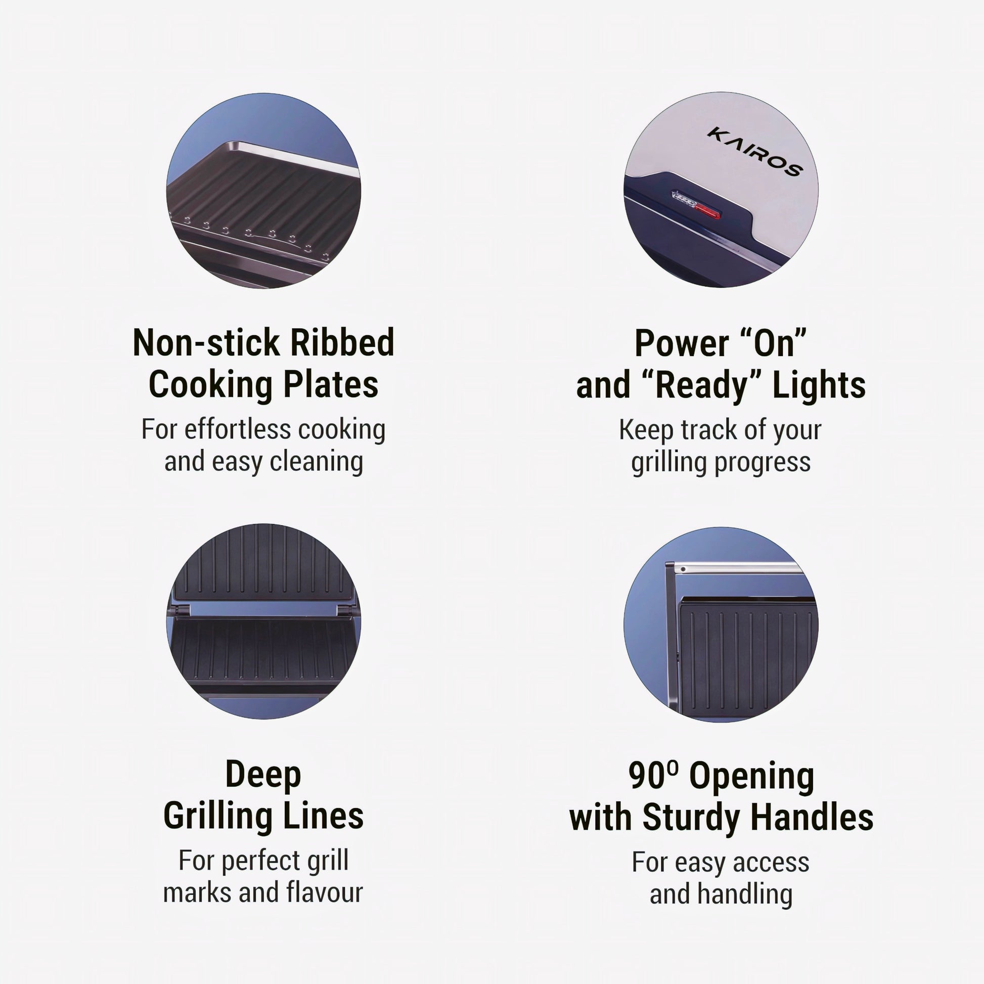•Non-Stick Ribbed Cooking Plates: Ensures effortless cooking with minimal food sticking.
