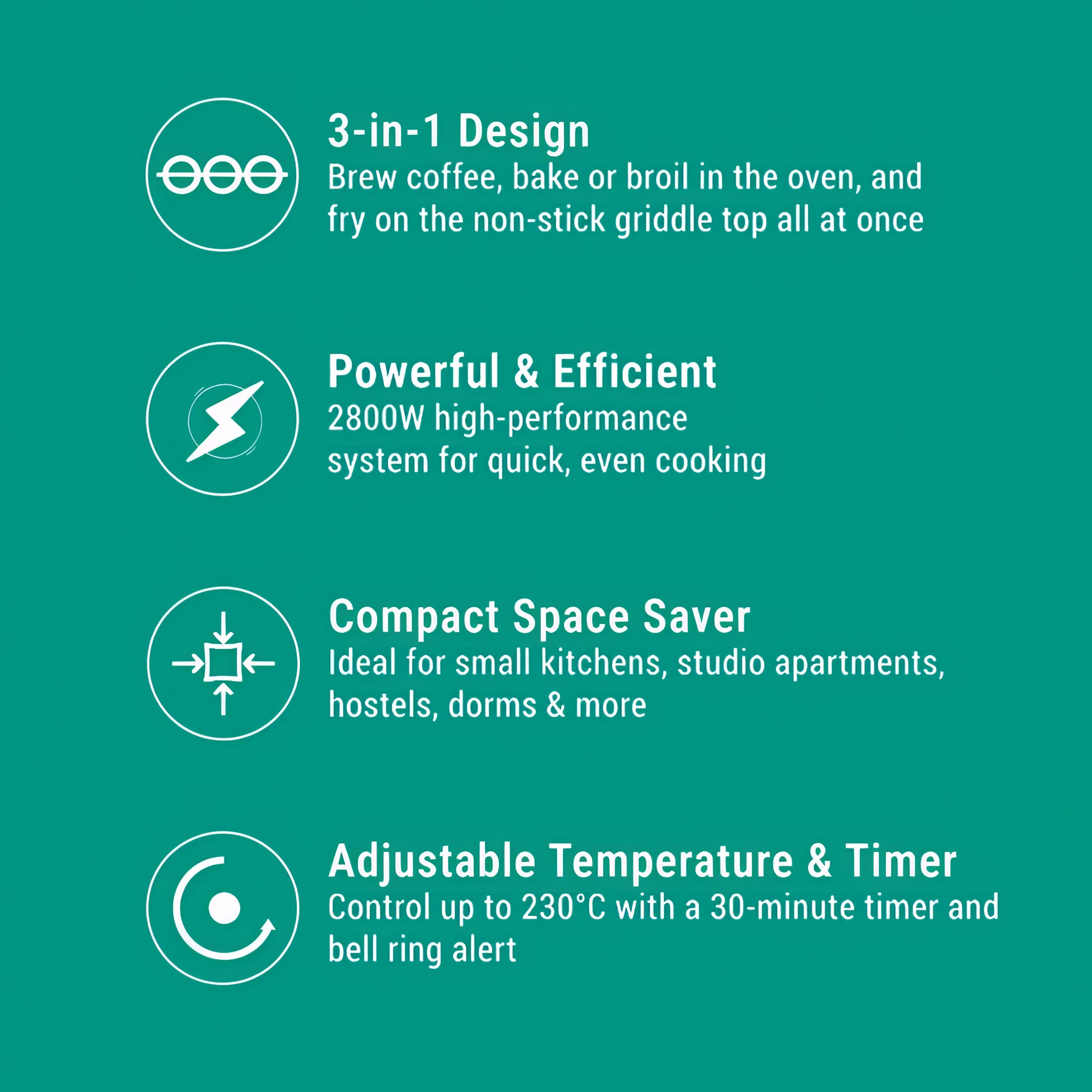 •3-in-1 Design: Coffee maker, 12L mini oven, and non-stick griddle