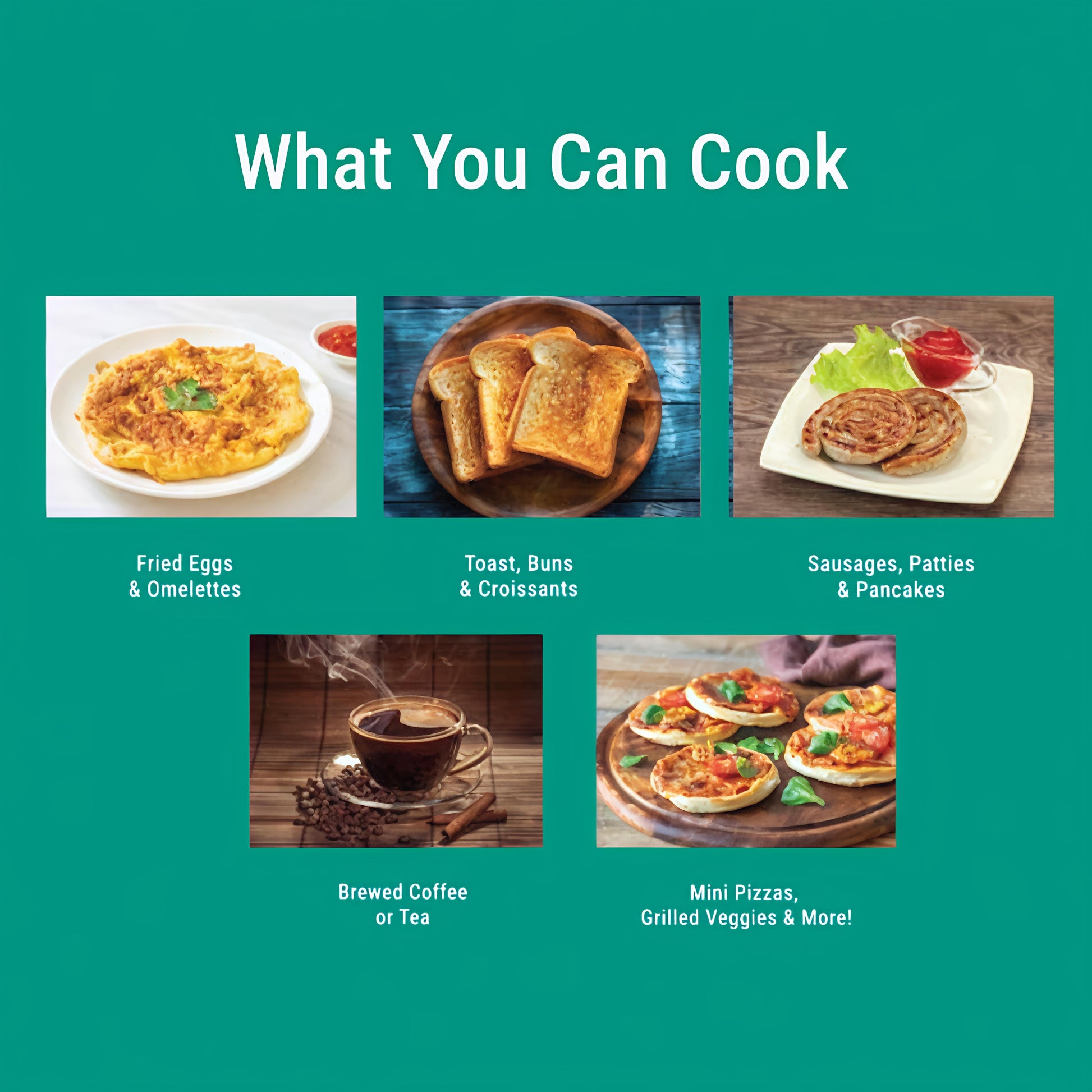 - What You Can Cook:Brewed Coffee or Tea,Fried Eggs, Omelettes, Sausages & Pancakes,Toast, Buns & Croissants,Mini Pizzas, Grilled Veggies, and More