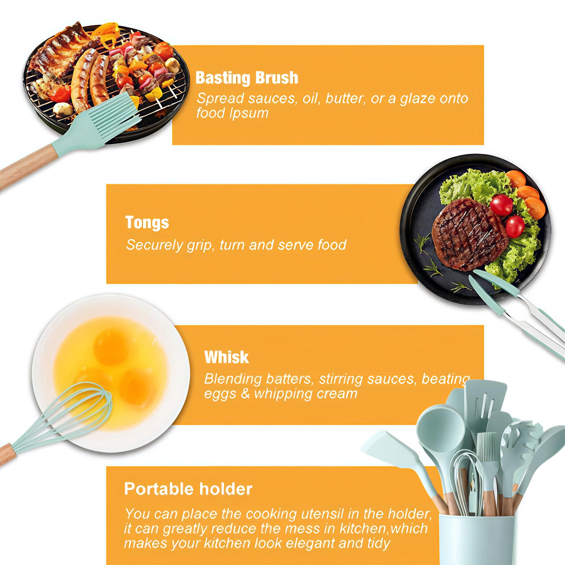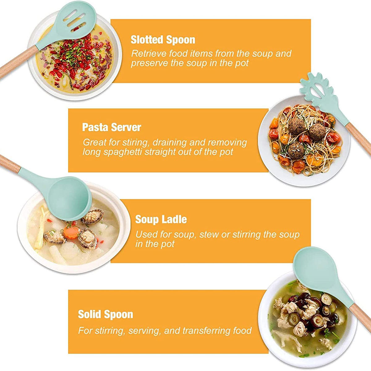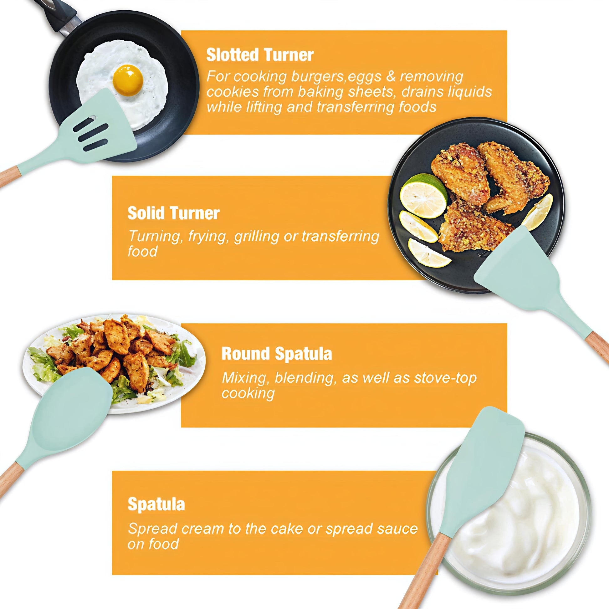 - PREMIUM MATERIAL: Made of premium food-grade silicone material with natural beech wood handles in a polished finish that doesn’t damage at extreme temperatures.
