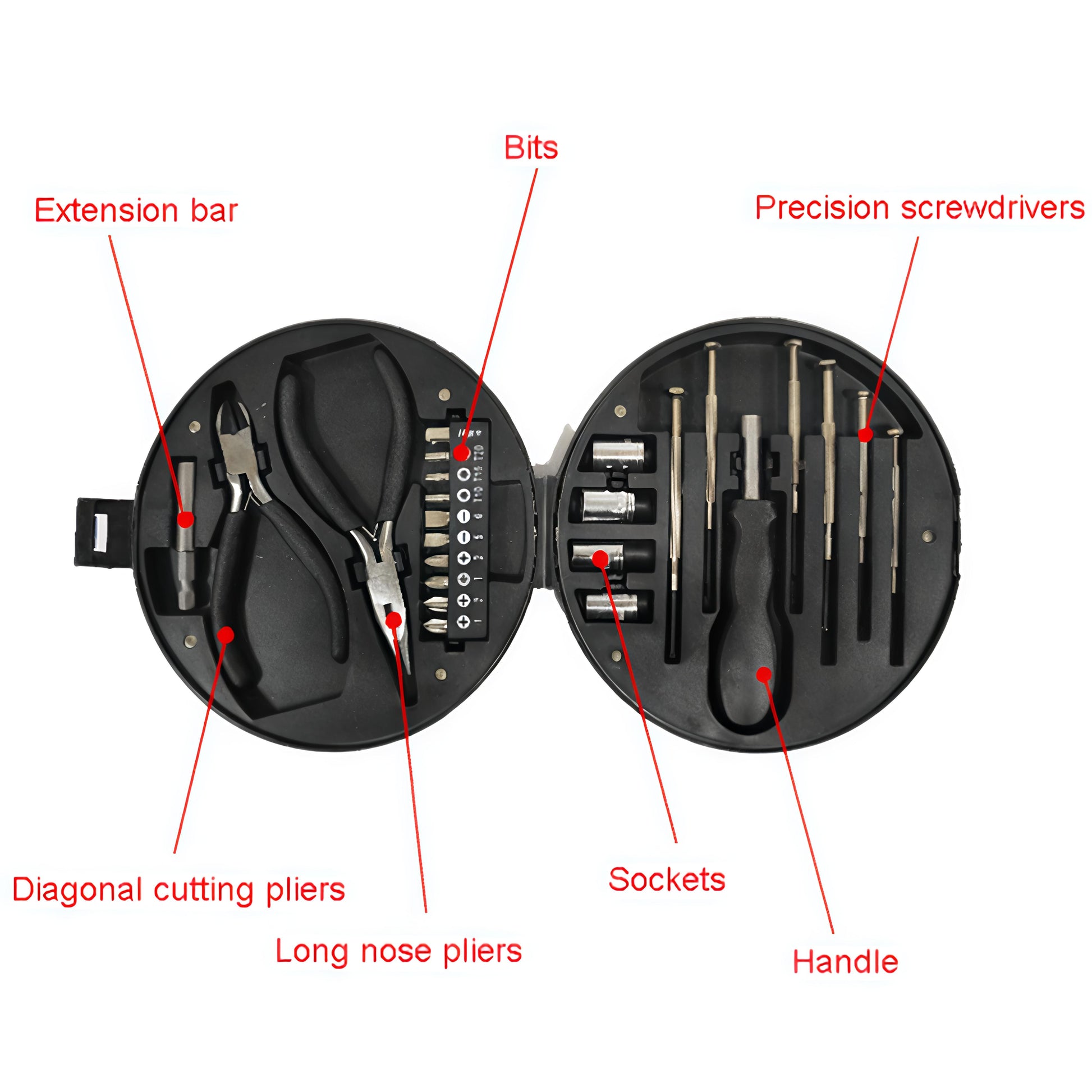 •Tool Kit Box Contains: 10 pcs screwdriver bits, 6 pcs precision screwdrivers, 4 pcs sockets,1 pc connecter, 1 pc screwdriver handle, 2pcs pliers