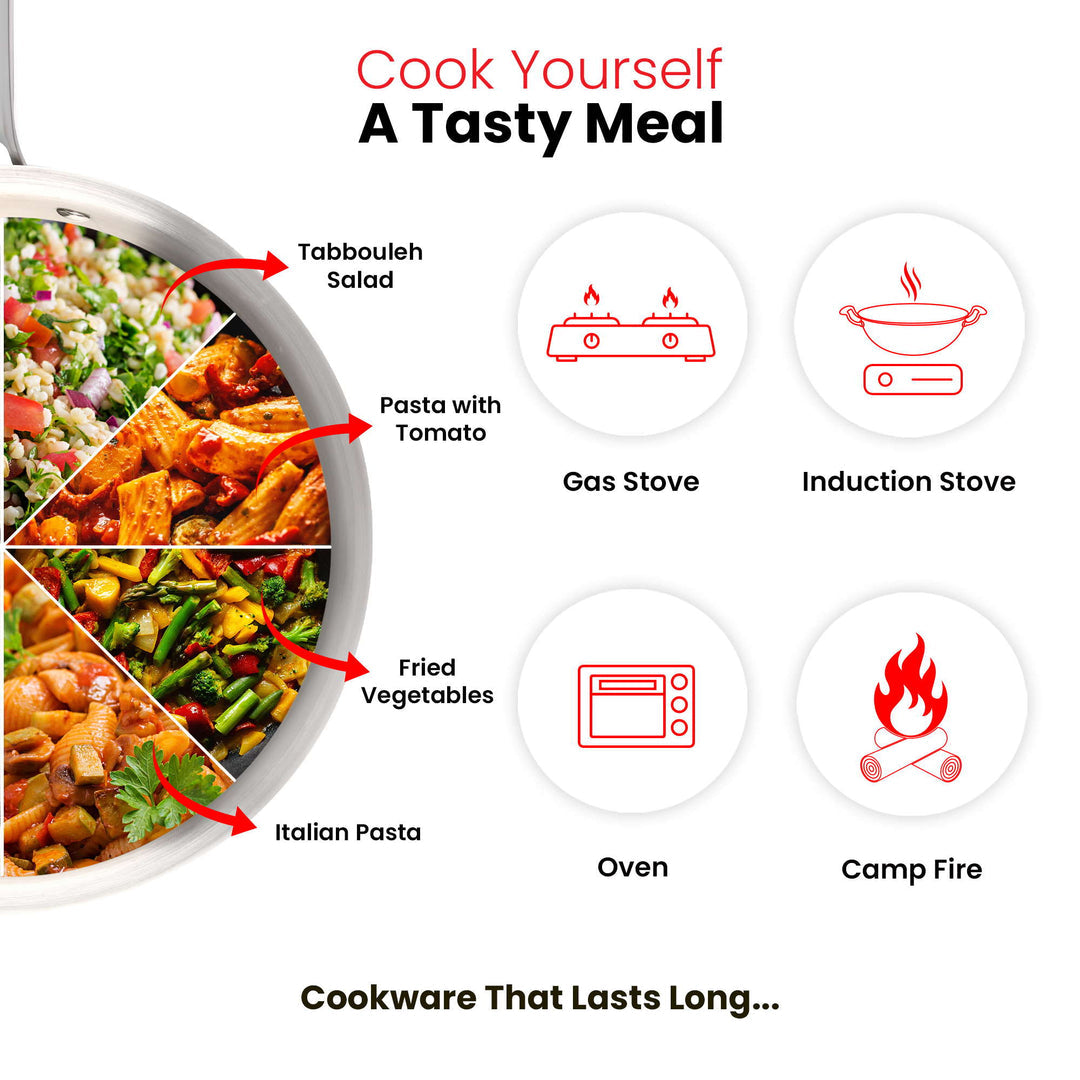 i) The inner shell is made from 18/8 stainless to ensure that it does not rust and to allow for a healthy cooking method with minimum oil. ii) The second layer/middle part is made of aluminum sheets that are edge-to-edge for even heat distribution. iii) The outer layer is 18/10 stainless for compatibility with induction. Maxima Triply Saucepan allows you to cook your food three times faster than with ordinary stainless steel cookware. The cast handles are durable, and stay cool for greater safety and convenience. The Saucepan features Flared Rims that allow for easy pouring without drips. This Maxima Tri-Ply Exclusive Stainless Steel Cookware Saute Pan, best suited for your kitchen, is a high-quality product. High-quality tools and accessories will make your kitchen life easier. These individual tools are easy to use, clean, and store. All of our products are made in India".