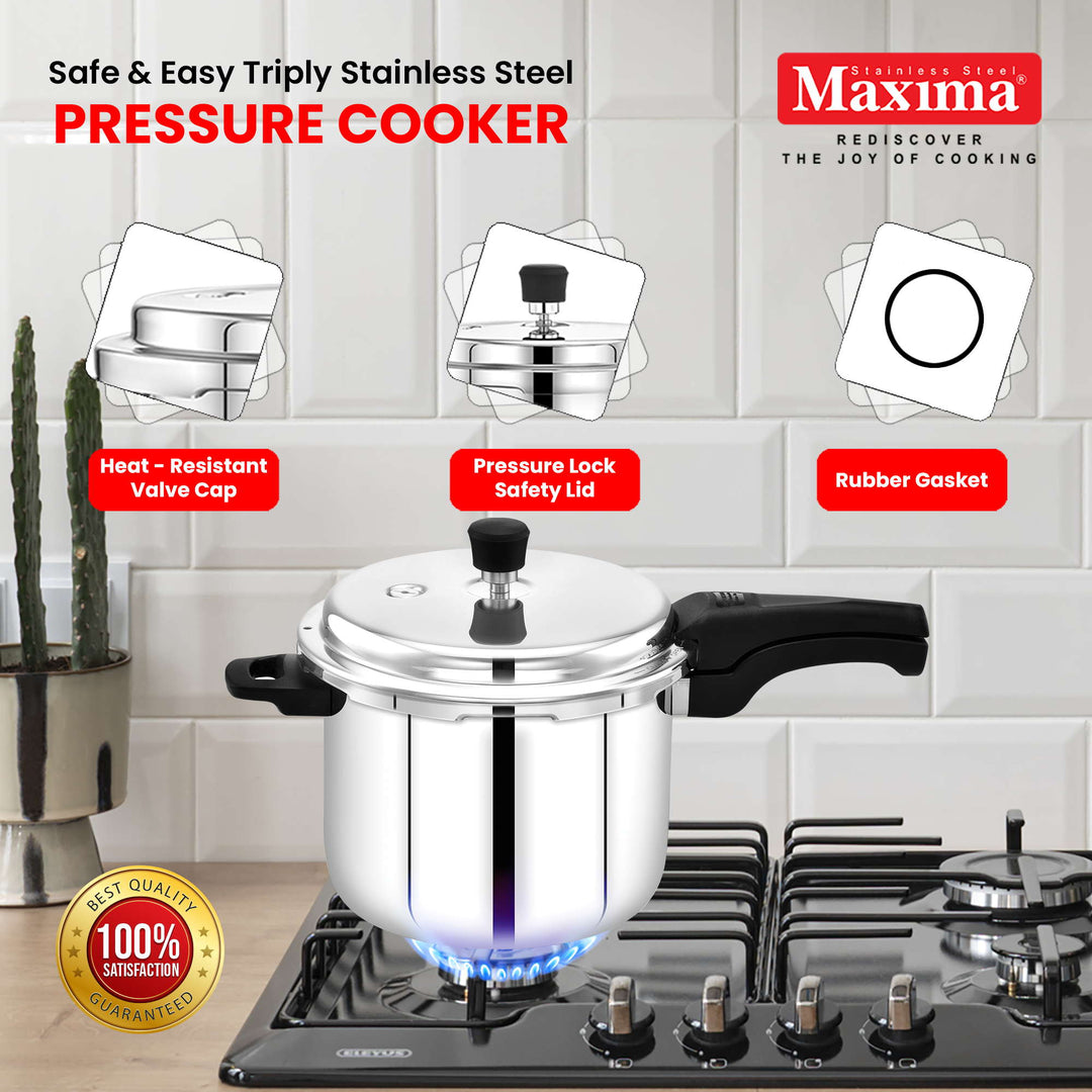 You are looking for the best Tri-Ply Non-Stick cookware? You are exactly where you need to be. Sumo Triply Stainless Steel Pressure Cooker (1.5 Litres), has all the features to make cooking faster and easier than conventional cookware. This pressure cooker can retain heat better because of its three layers: two stainless steel, and one aluminum. The pressure cooker is very effective at evenly distributing heat over the entire surface. All these features help in faster cooking and lower energy consumption. All products are designed to be both functional and beautiful. The pressure cooker is both elegant and safe. The product is corrosion and rust-resistant, so it will last a very long time. Maxima Kitchenware offers our Tri-Ply stainless steel pressure cooker online.