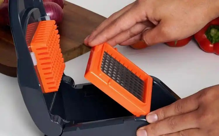 This innovatively designed Meyer vegetable grater boasts a built-in container for effortless food preparation. With advanced sliding technology and razor-sharp blades, it offers enhanced comfort, safety, and durability.