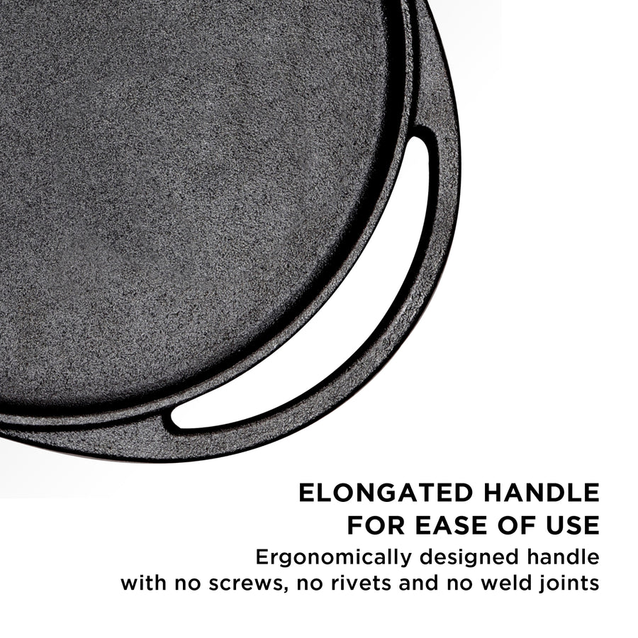 The Meyer Pre-Seasoned 30cm Cast Iron 2-in-1 Grill & Griddle is made from pure iron ore and is completely toxin-free, with no chemical or synthetic coatings. Pre-seasoned with 100% vegetable oil, it develops a natural non-stick surface over time while delivering excellent heat retention and even heating for gas-saving cooking. Its reversible design features a flat tawa for daily cooking and a ridged grill side for searing and barbeque, along with a pouring spout for excess oil. Built with heavy-gauge cast iron for durability, it enhances authentic Indian flavours, includes an ergonomic handle, supports high-heat and outdoor cooking, and comes with a hassle-free lifetime warranty.