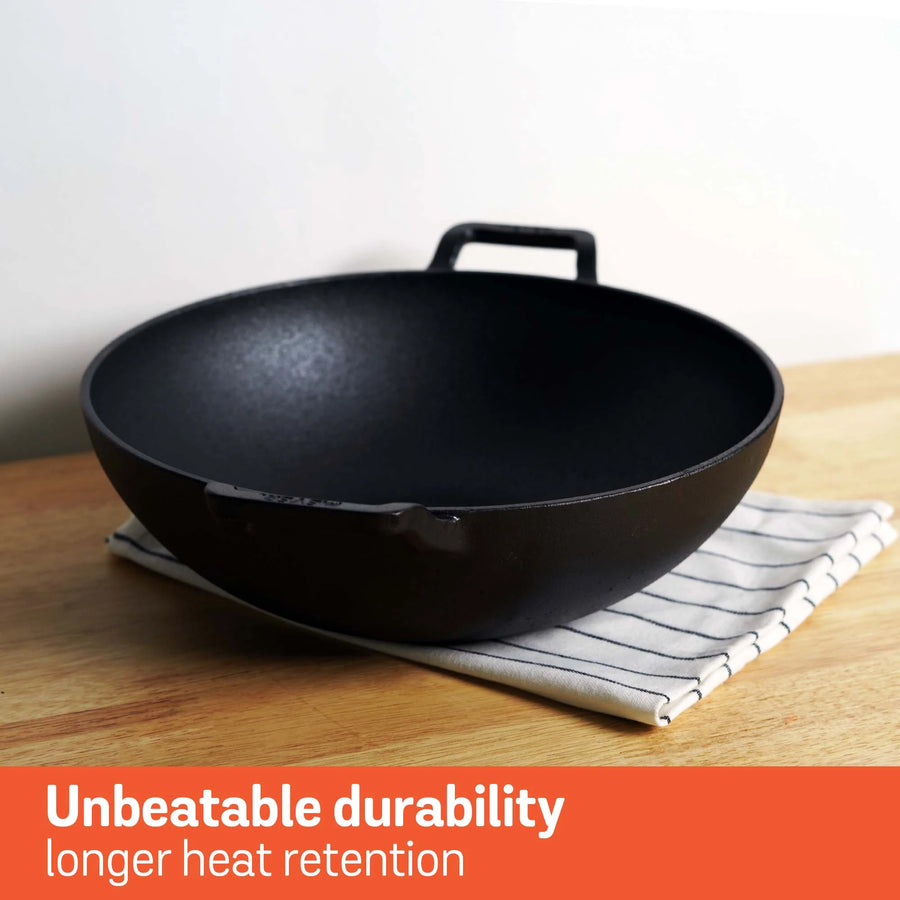 Crafted from heavy gauge durable cast iron construction, this cast iron kadai ensures quick and even heating, while retaining heat for longer periods of time even at low flame. |