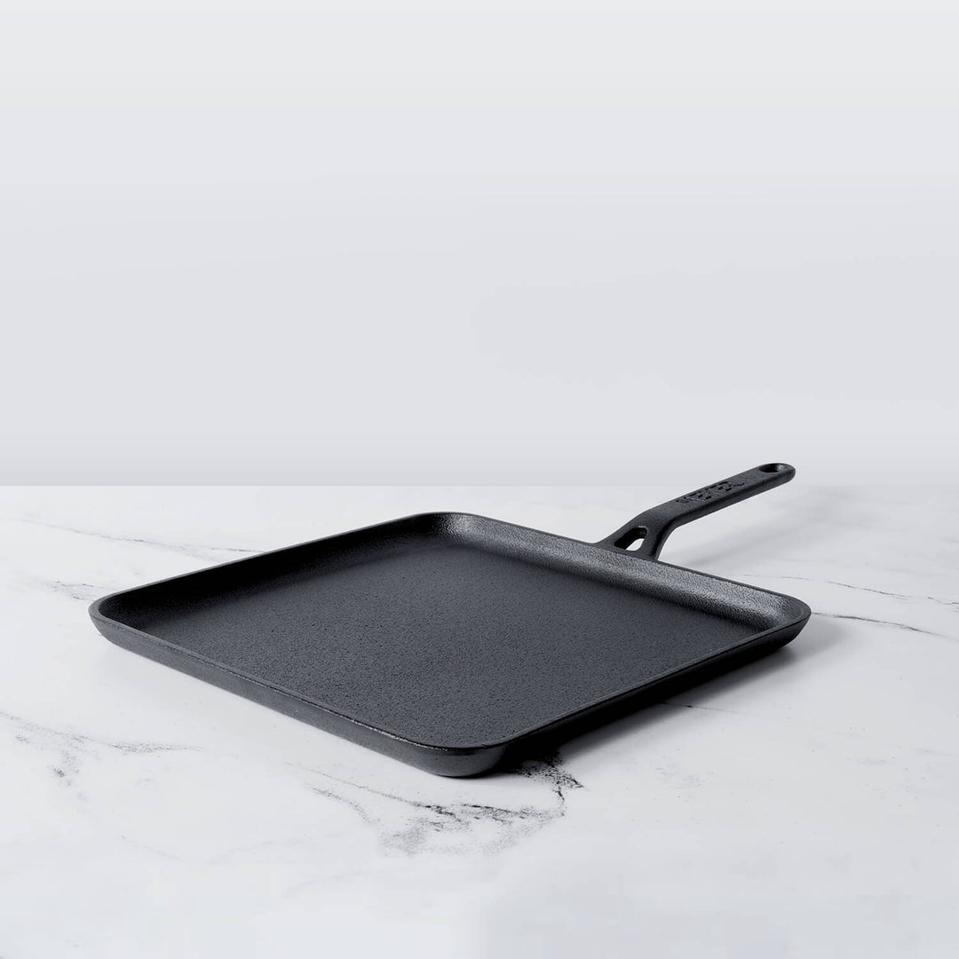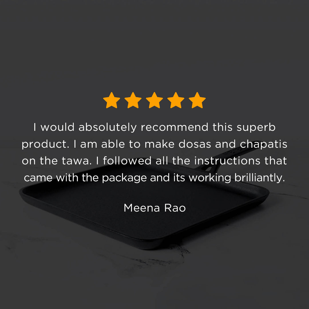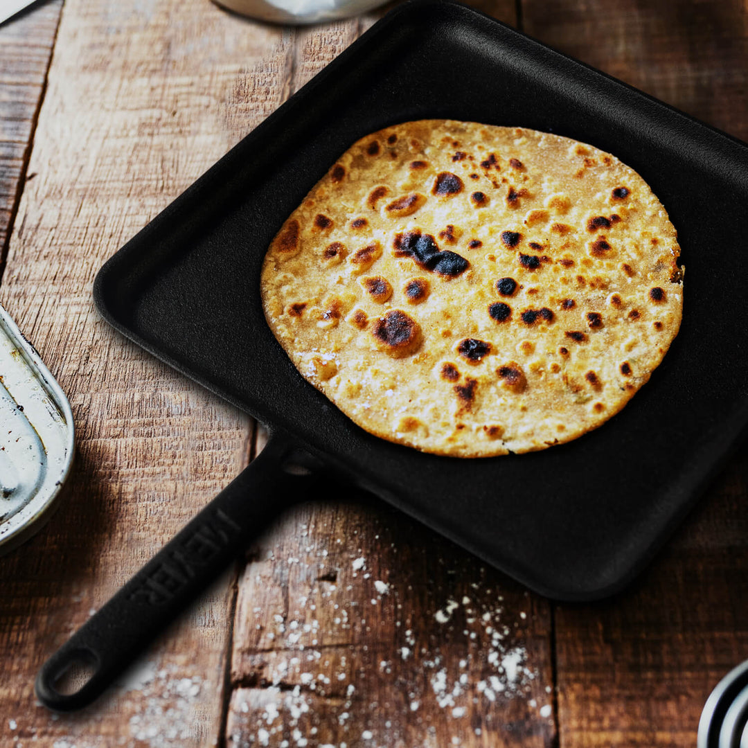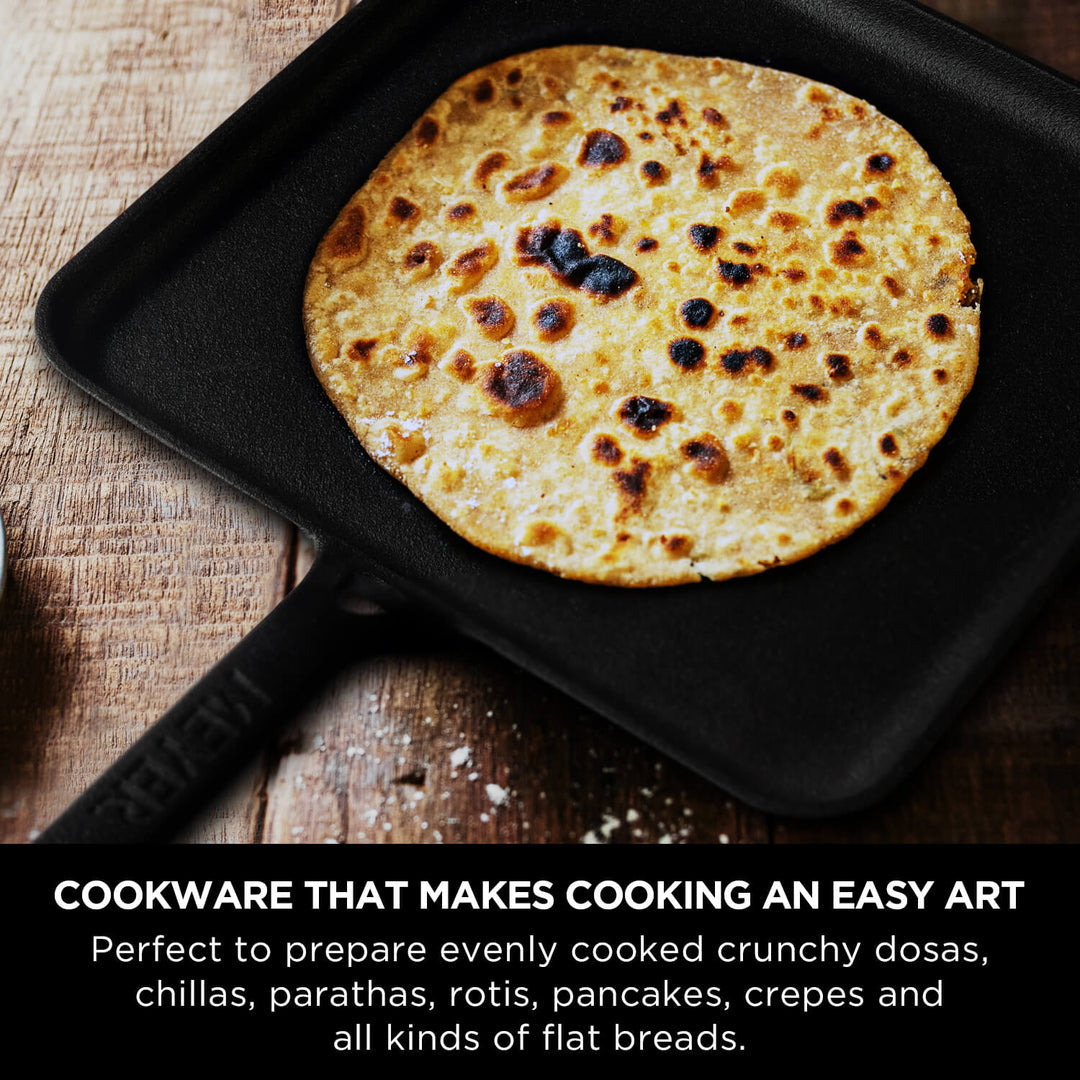 This square cast iron tawa measures 45.7 cm in length (handle to handle) and 28.7 cm in width, with a sturdy 0.4 cm thickness and a solid weight of 2.78 kg, ensuring excellent heat retention and durability. Finished in a classic black colour with a square shape, it is designed for versatile everyday cooking. The tawa is not dishwasher safe and should be hand-washed for best care. It is compatible with all cooktops, including induction. Marketed as the Meyer Pre-Seasoned Cast Iron Square Tawa, 28 cm, it is sold and imported by Meyer Housewares India Pvt Ltd, New Delhi. The package includes one square tawa, along with use and care instructions and a warranty card.