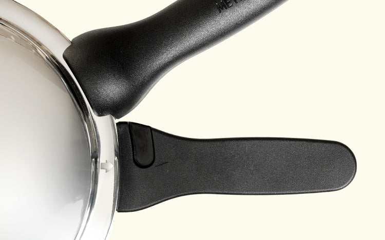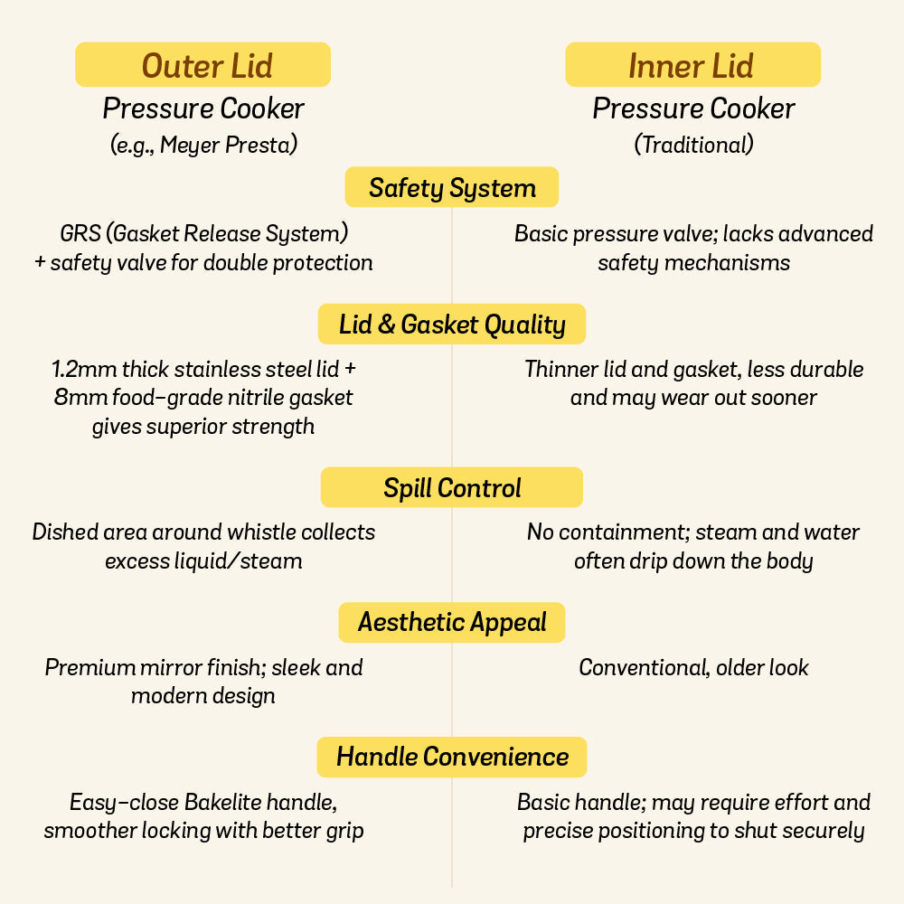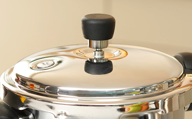 Expertly crafted in India, this silver tri-ply stainless steel pressure cooker combines durability with advanced safety features like a step lid with vapour storage, an advanced safety valve, and ergonomic heat-resistant handles. Suitable for gas, electric, and induction cooktops, the range includes a 2L model (1.5kg) measuring 33.5cm in length with a 7.2cm internal depth, and a deeper 3L version (1.9kg) measuring 38.5cm in length with an 11.3cm internal height. Backed by a 5-year warranty, these round cookers are dishwasher safe (excluding the lid) and designed for versatile everyday cooking.