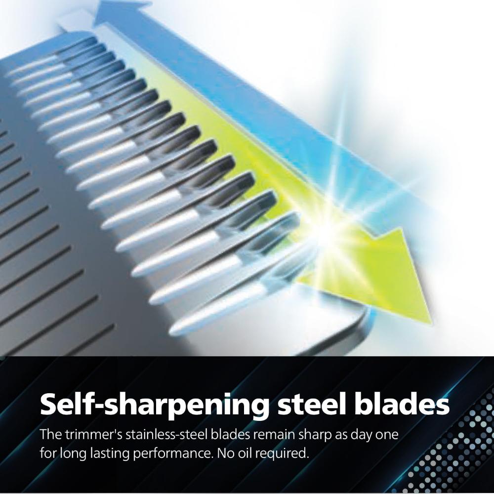 The trimmer's stainless steel blades remain sharp as day one for long lasting performance. No oil required.