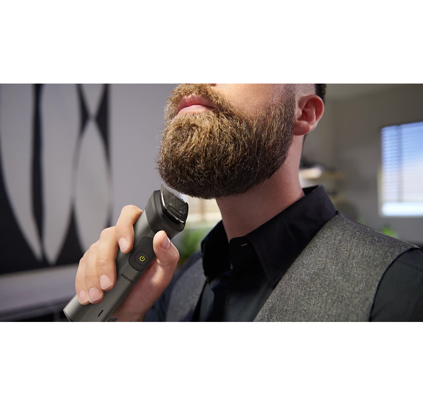The trimmer and its multi-comb set offer 17 length settings from 0.5 to 16 mm in up to 0.2 mm precision steps for shorter and longer beard styles. The narrow design of the precision trimmer attachment makes it easy to create sharp edges and fine details. The metal trimmer attachment cleans up cheeks, chin and neck to finish your look.